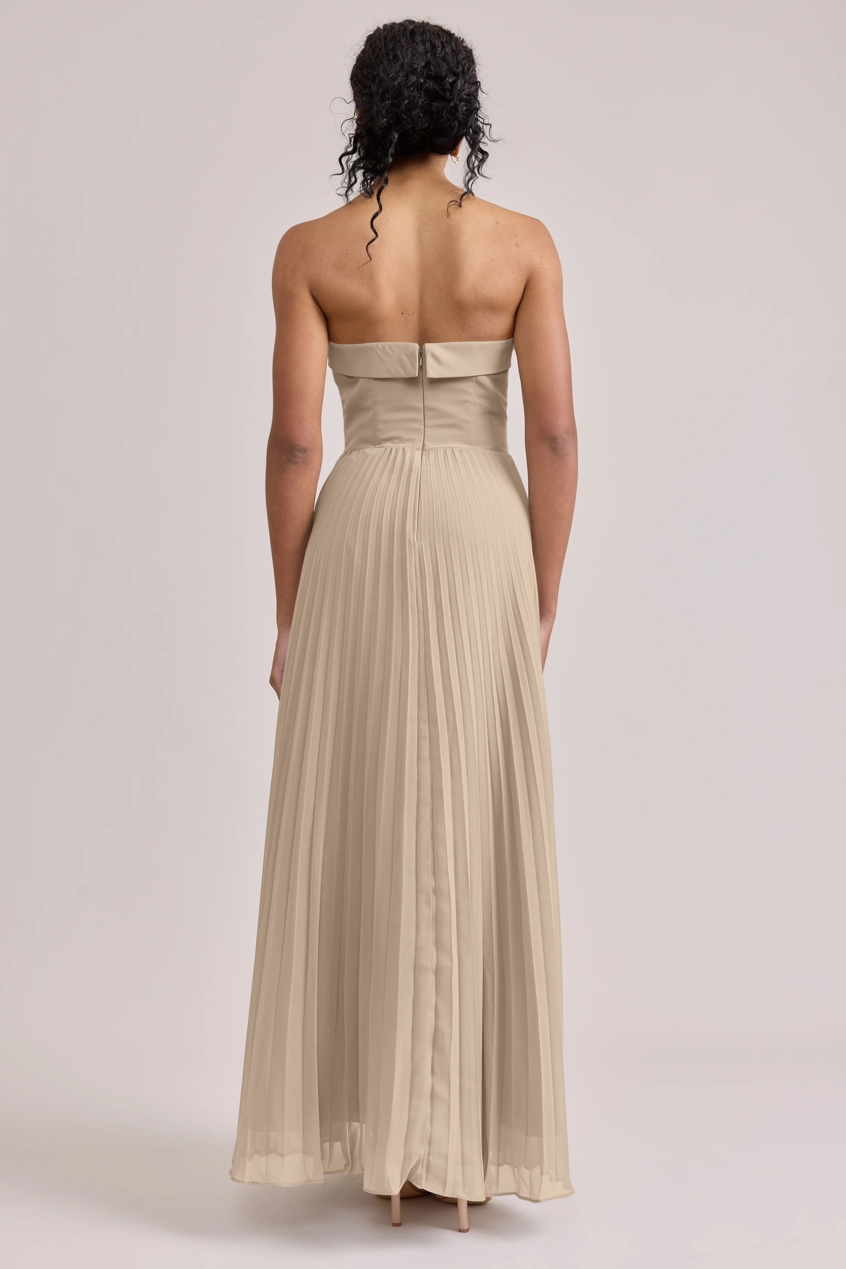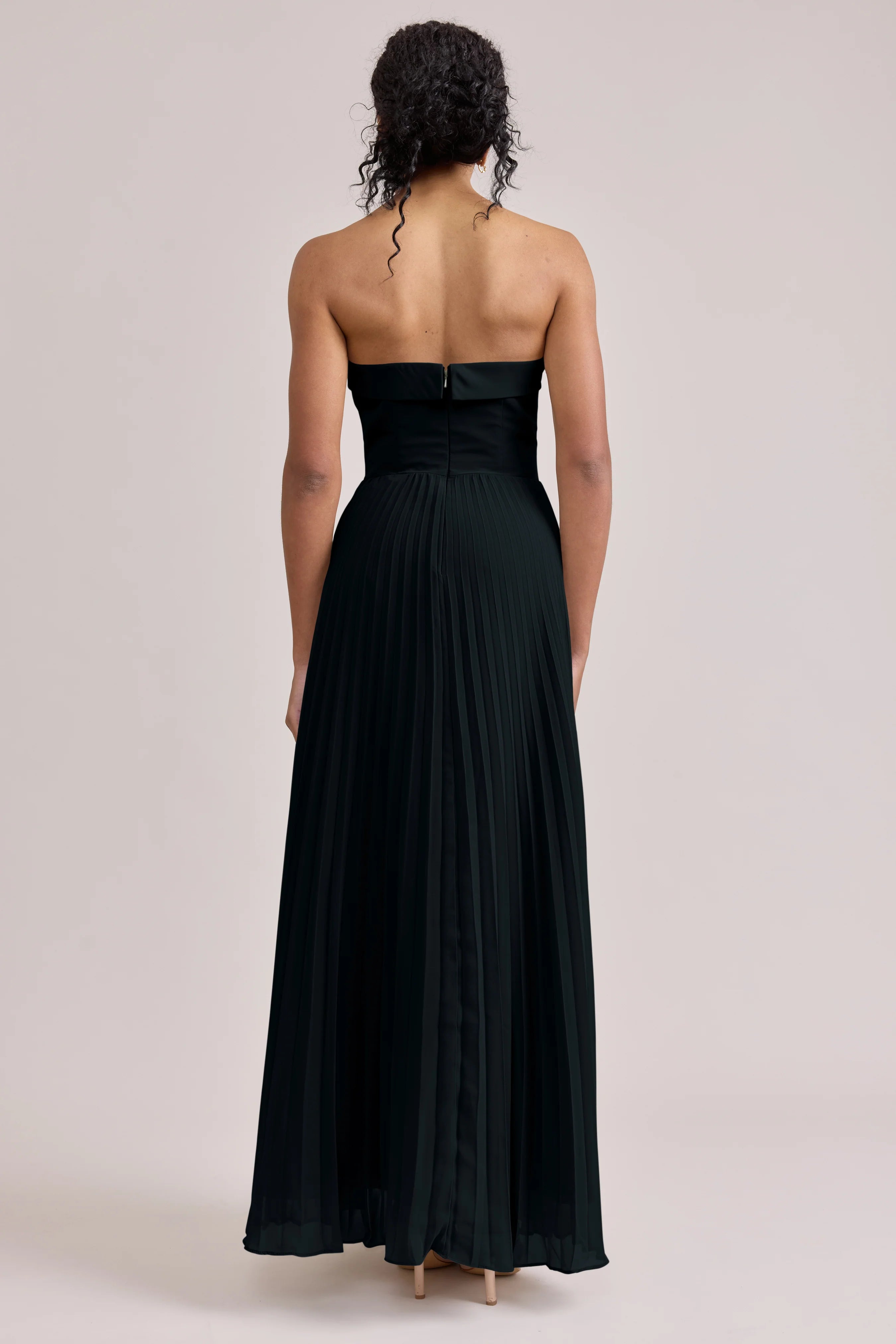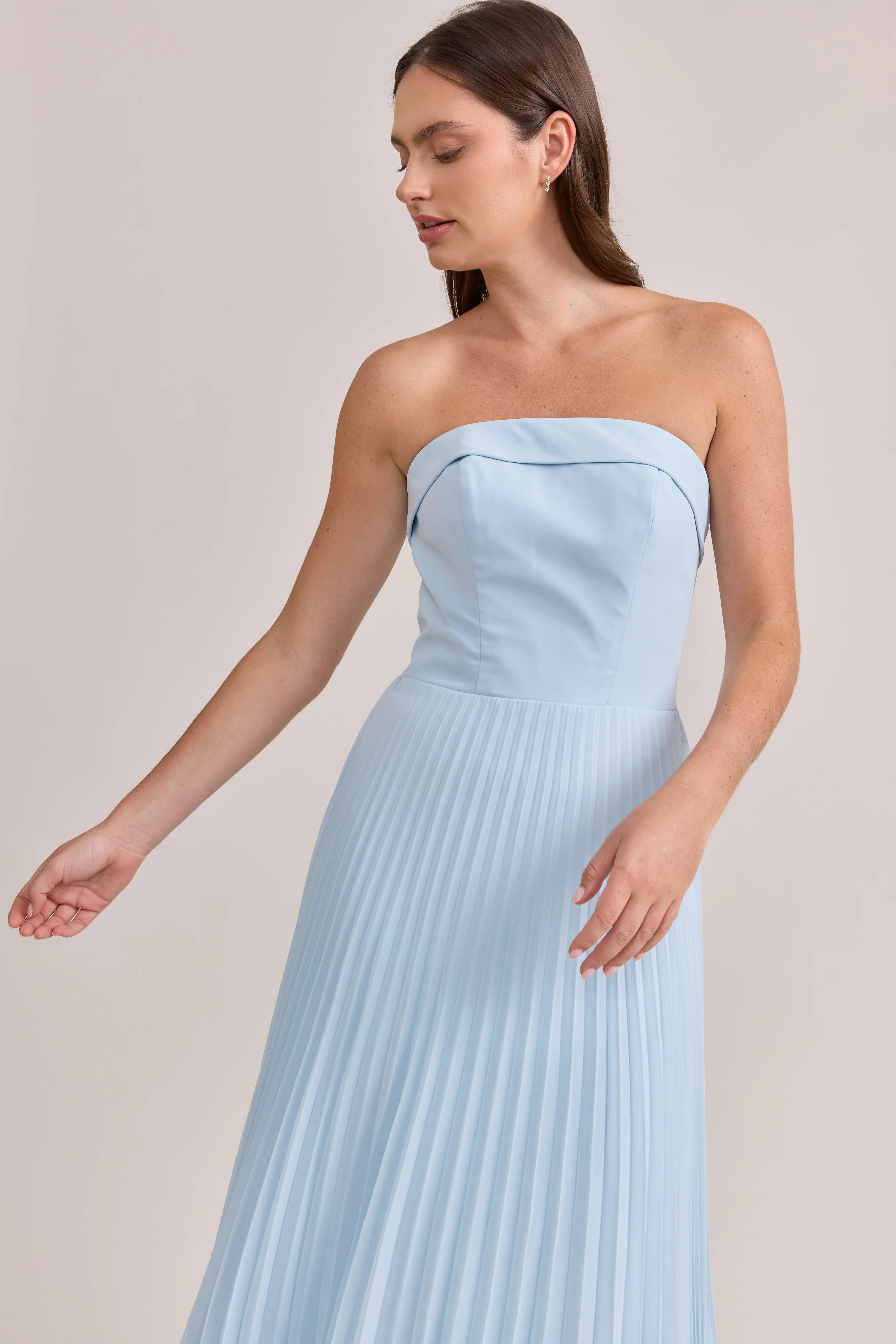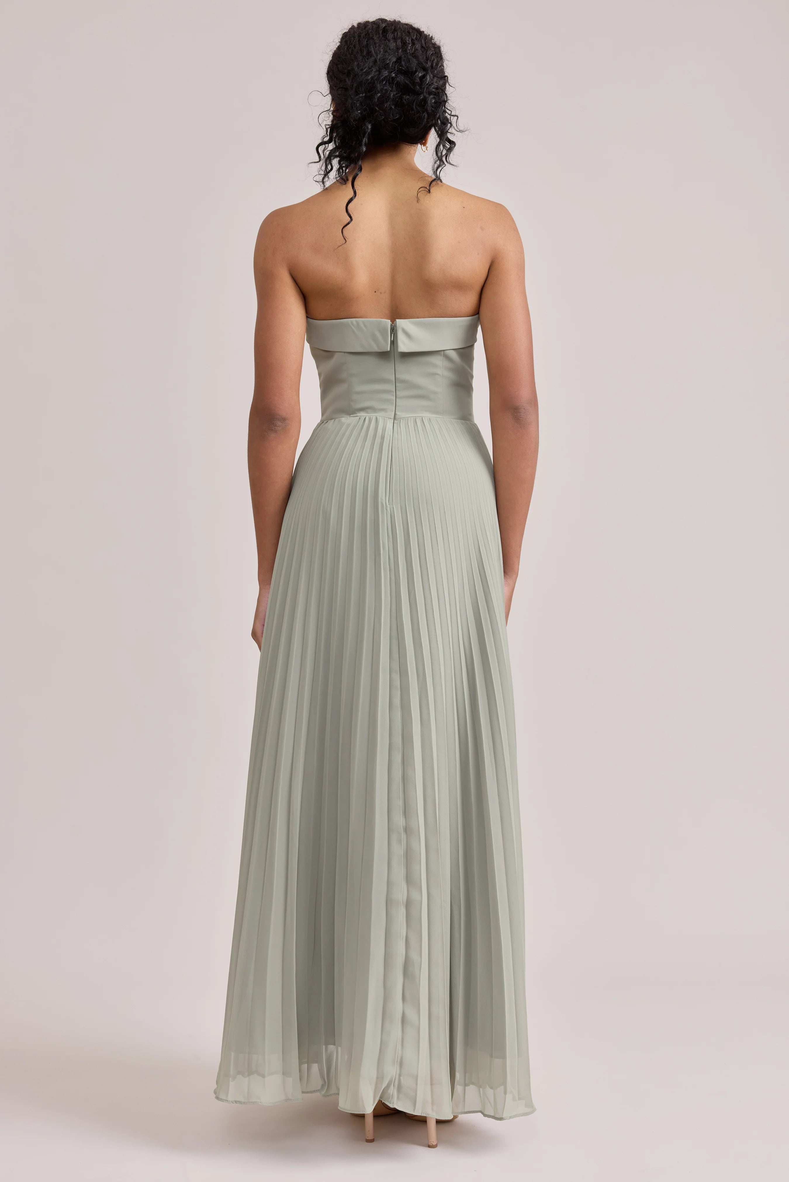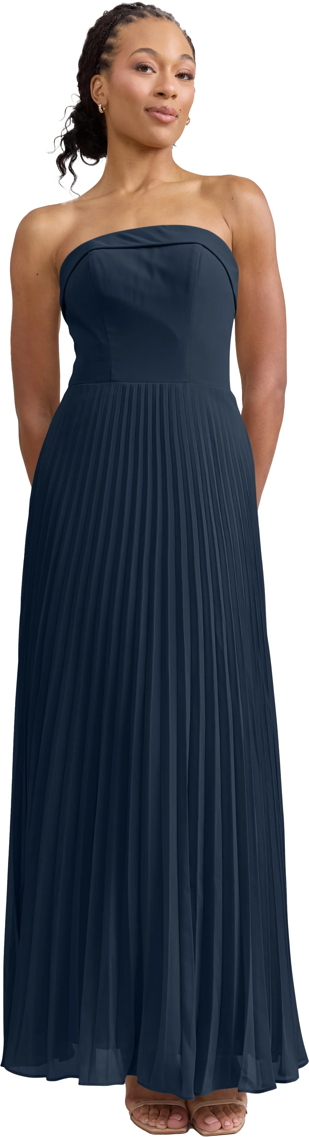 The best-selling Saylor Satin Pleated Dress is now available in Chiffon. A jaw-dropping strapless dress, Saylor will become essential for your elevated wedding line-up. Saylor features a fold over straight-cut neckline and back in our regular chiffon fabric that flows into a vertical pleating skirt at a dropped waistline. Pair with our floral chiffon dresses for the perfect “European Garden” look!