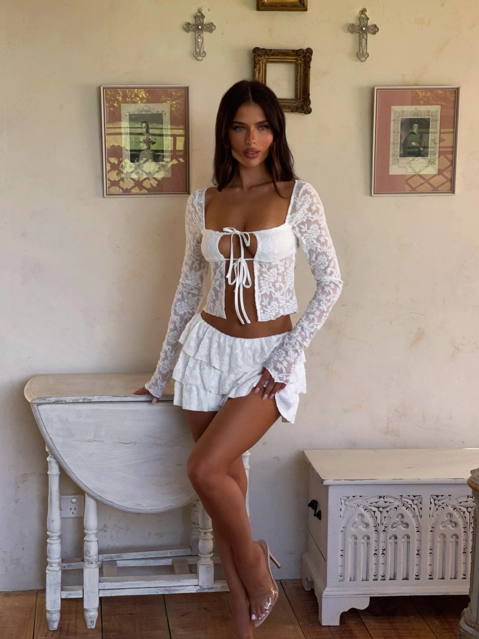 Style Sylvia with the matching 'Sylvia Mini Skirt' in White for a coordinated moment, or layer her over high-waisted denim and strappy heels for a chic yet playful look.