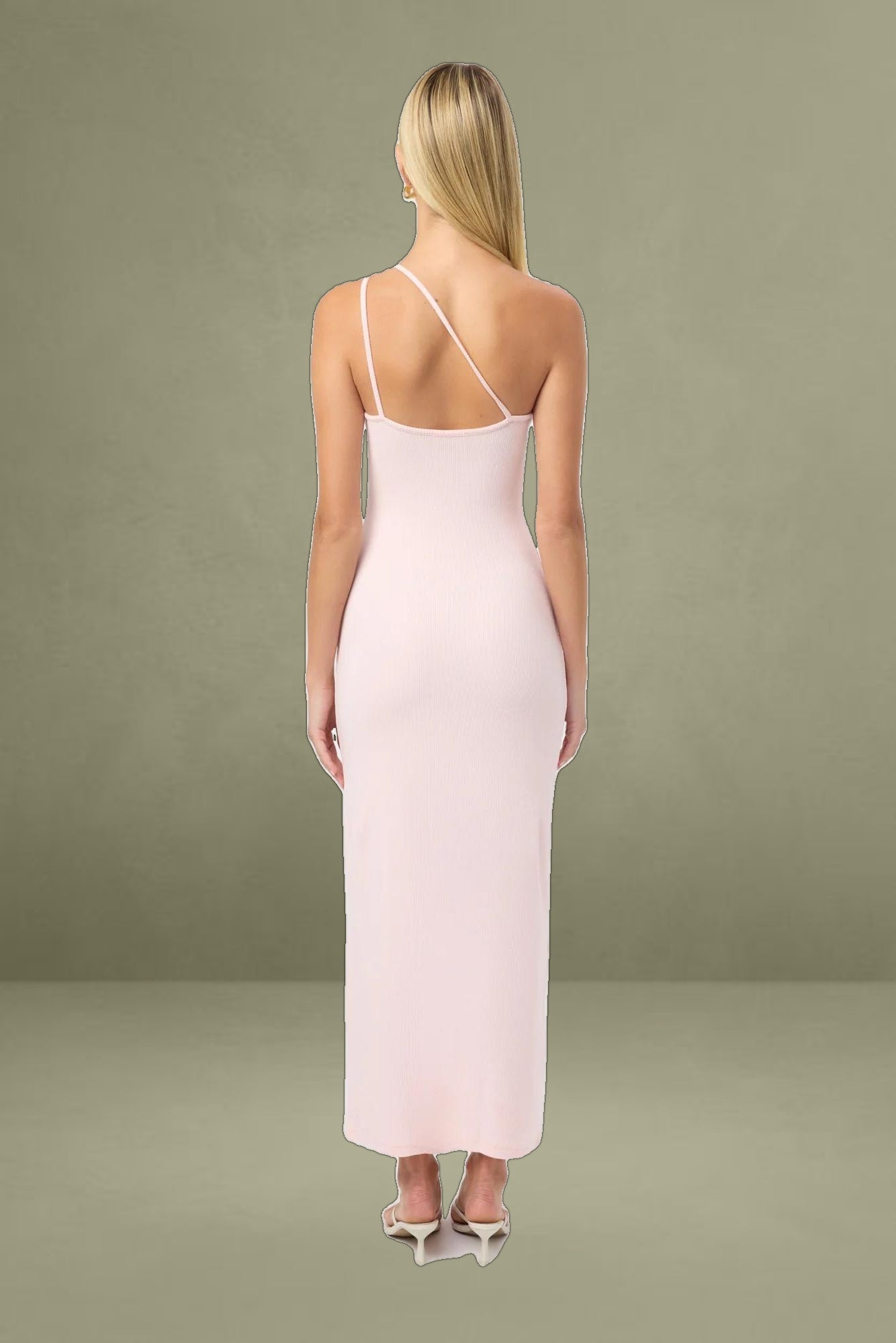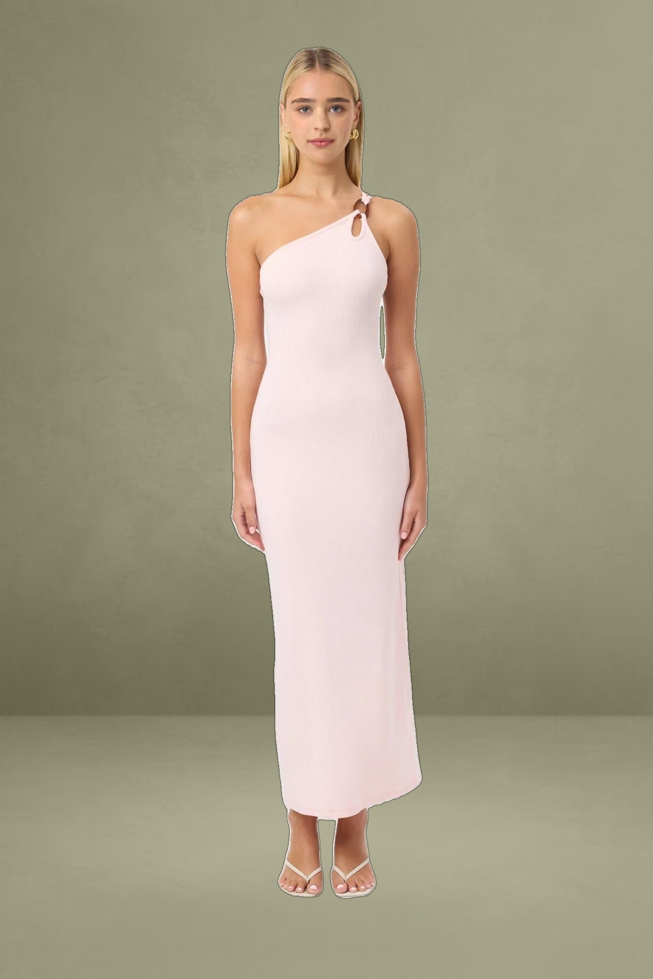 Discover this dress. It has a maxi style and a single-shoulder design, radiating elegance. There's a brown tortoise-like ring and a small keyhole cutout at the shoulder. Made from ribbed cotton-modal fabric, its soft pink color and form-fitting shape make it essential for your event wardrobe.