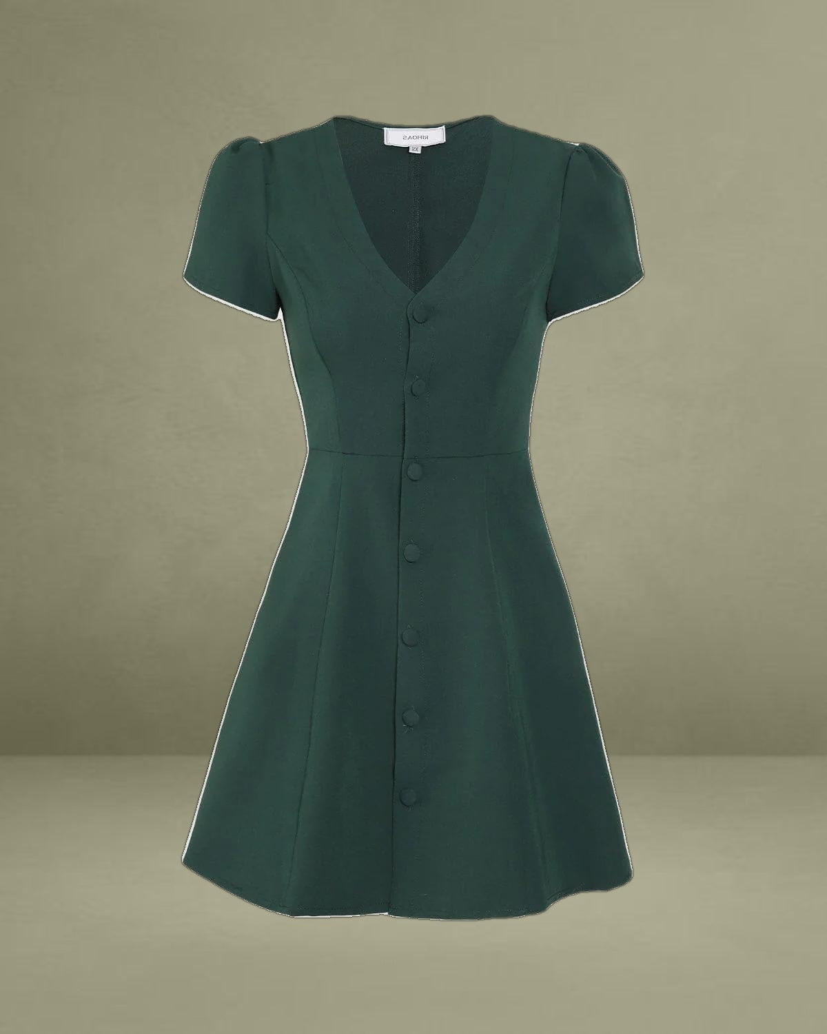 This Button Up Mini Dress is a stunning and elegant dress that is perfect for any occasion. The A-Line, v neck and button design adds a touch of sophistication to the dress. The slim and flowy fit make it comfortable and easy to wear, while also creating a flattering silhouette that accentuates the figure.