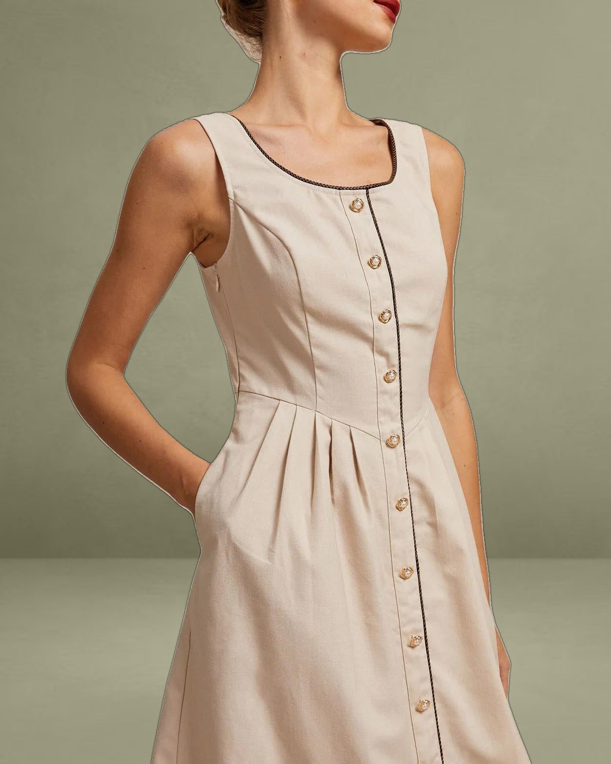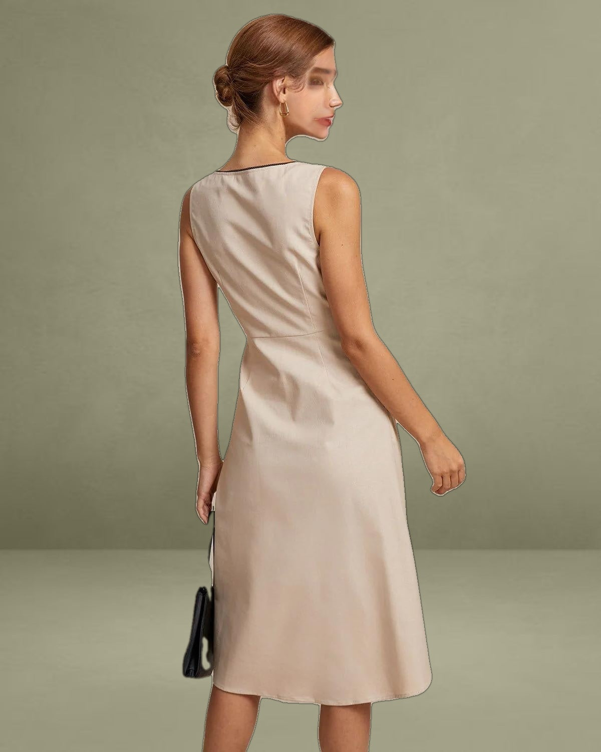 This Sleeveless Midi Dress is made of Cotton and Linen. Cotton fabric features humidity balance, durability, and eco-friendly nature, feeling soft but not stiff when touching the skin. Linen is strong, naturally moth resistant, biodegradable and recyclable.