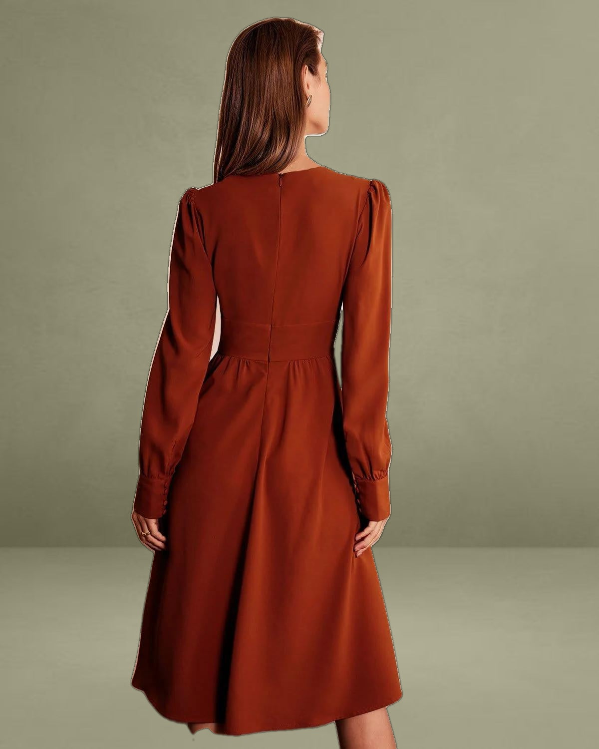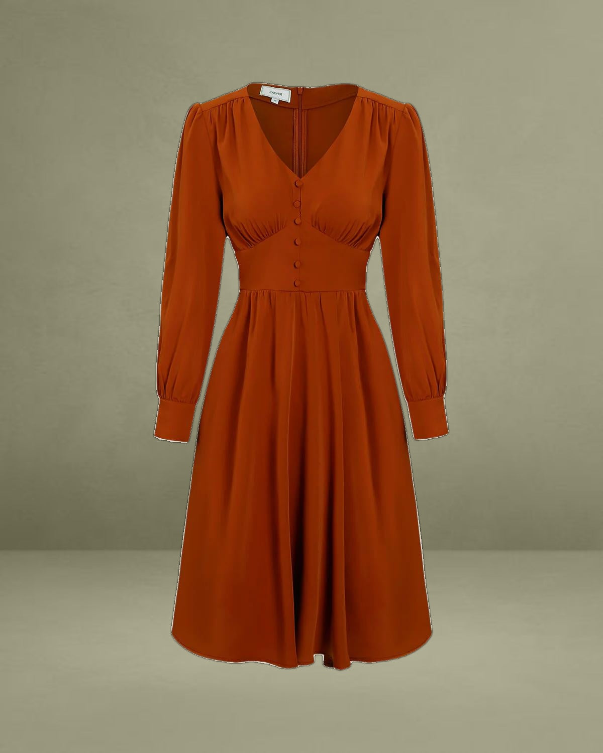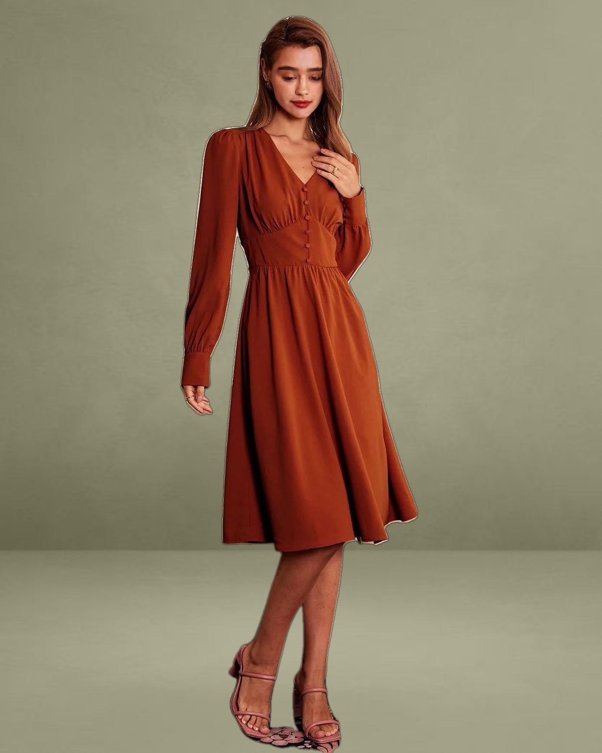 This V Neck Midi Dress is a perfect choice for any occasion. The high waisted, button and A Line design of the dress adds movement and flow, making it easy to wear and dance in. The ruched and pleated detail adds a feminine touch and makes this dress perfect for any occasion. Whether you're going out on a date or attending a formal event, this dress is sure to turn heads and make you feel fabulous.