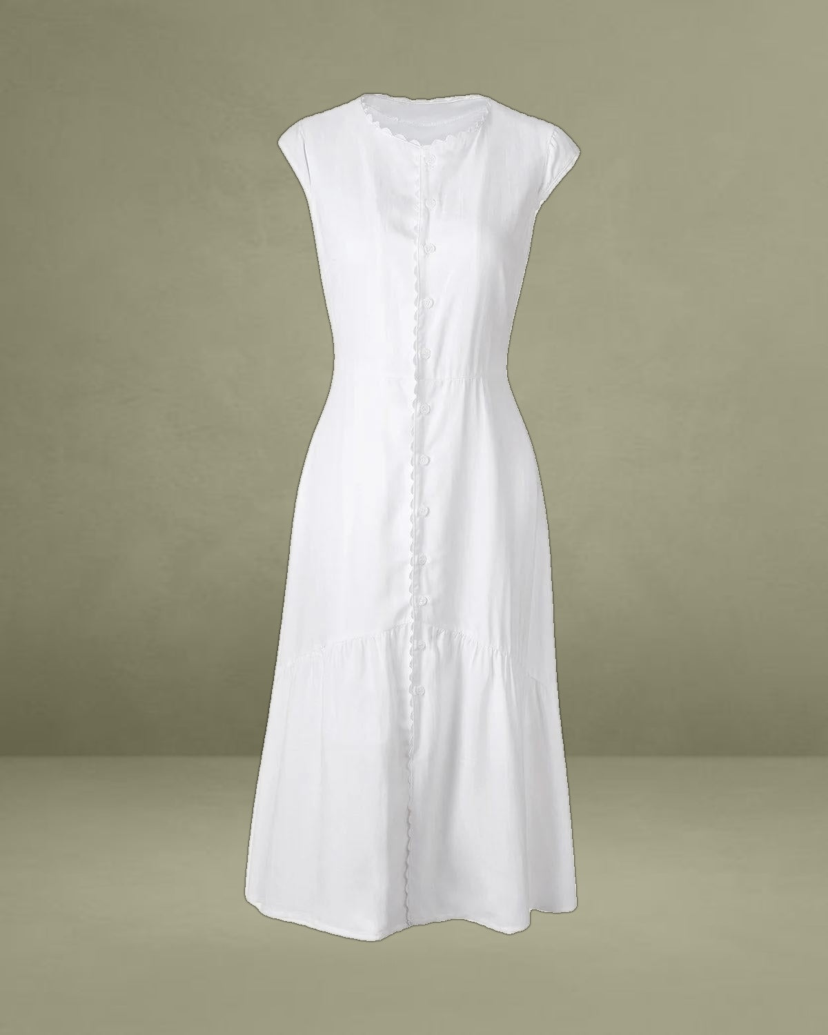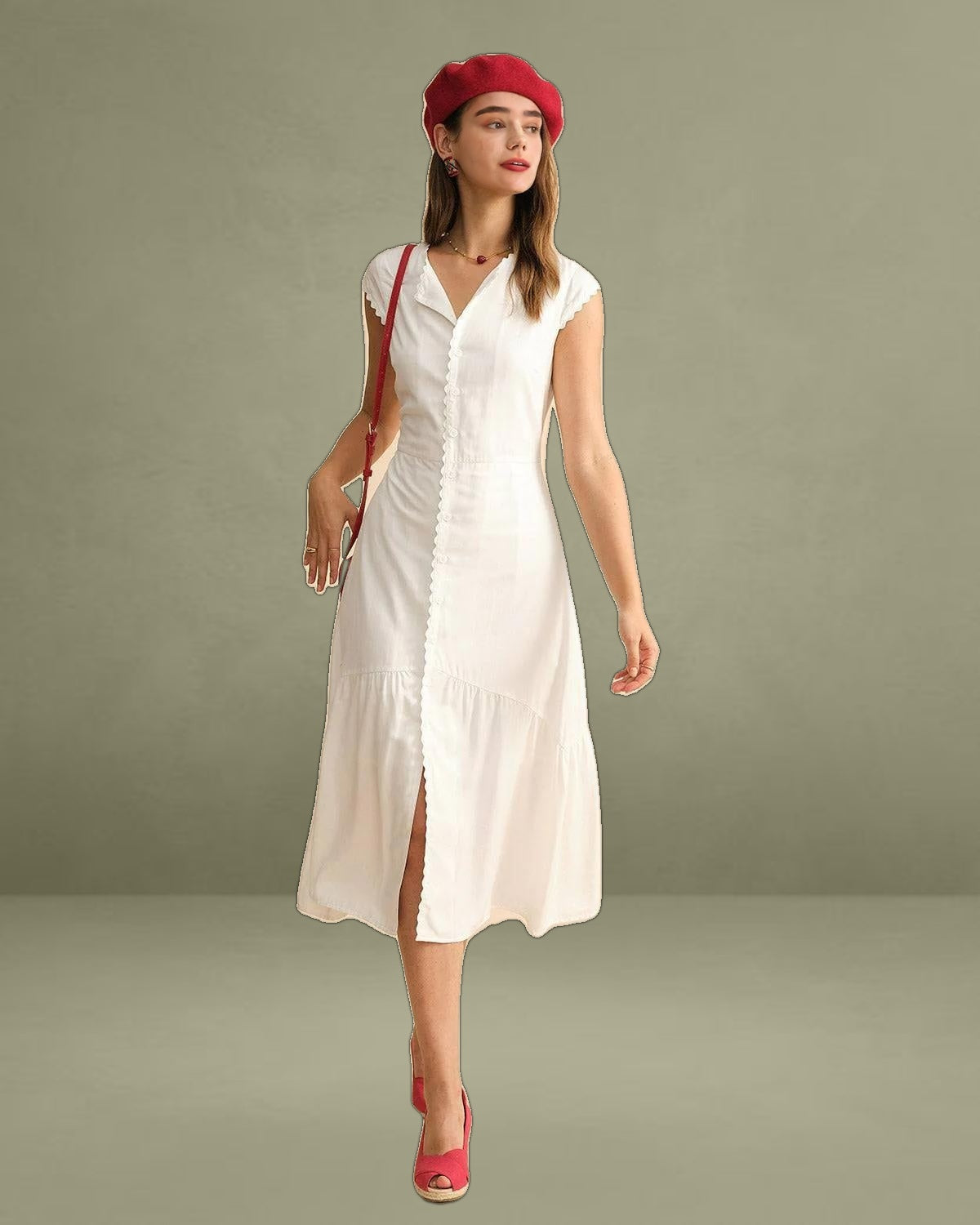 This midi dress is absolutely a gift for women for the simple cut shows female grace and gentleness to the fullest. Featuring a lapel and a v-neck, as well as the cap sleeve, the female upper part is much more stereo. Plus, the high-waisted design offers women a good figure ratio, while the ruffle trim decorates female legs and adds enough sense of design to it. The white is perfect for all occasions.