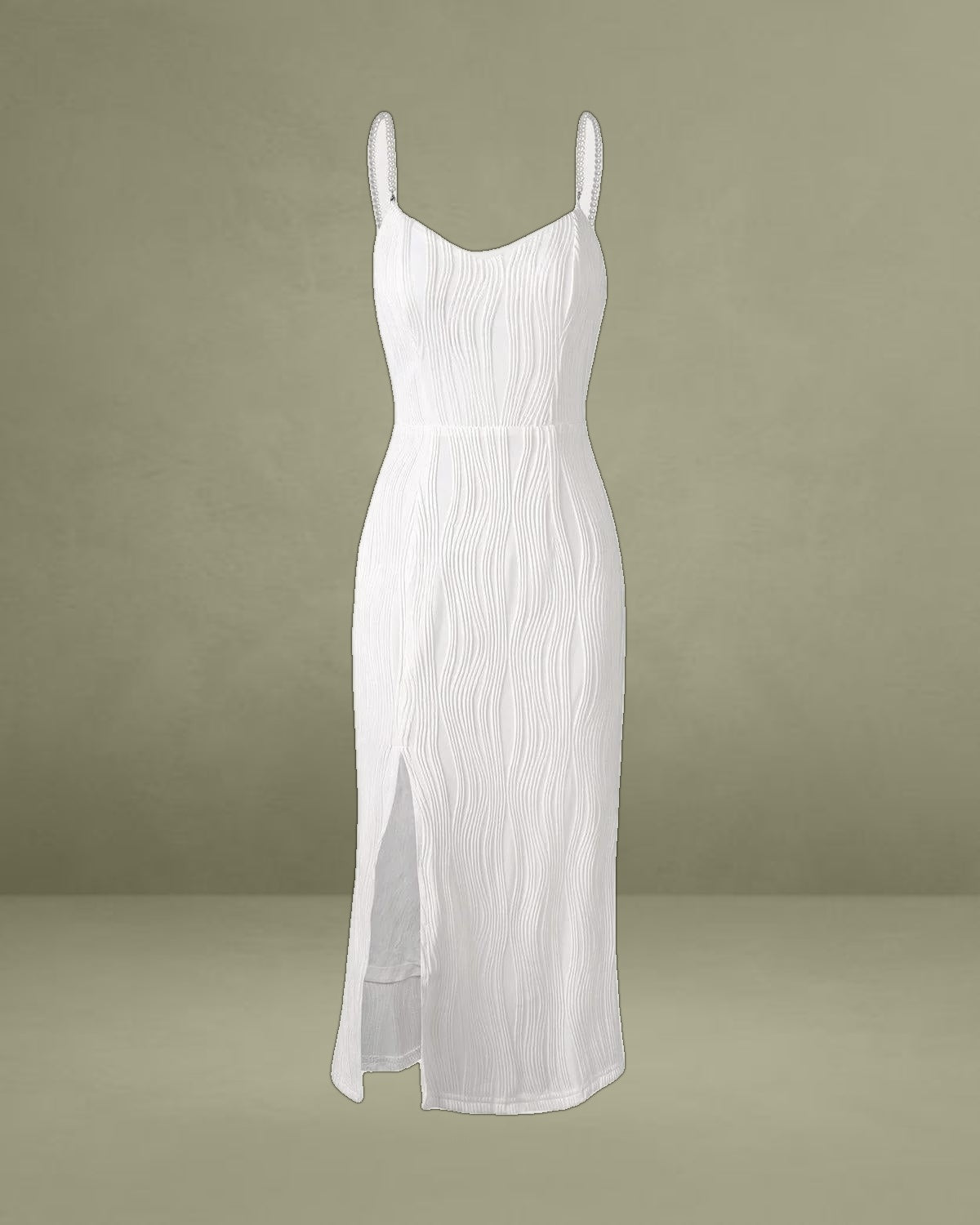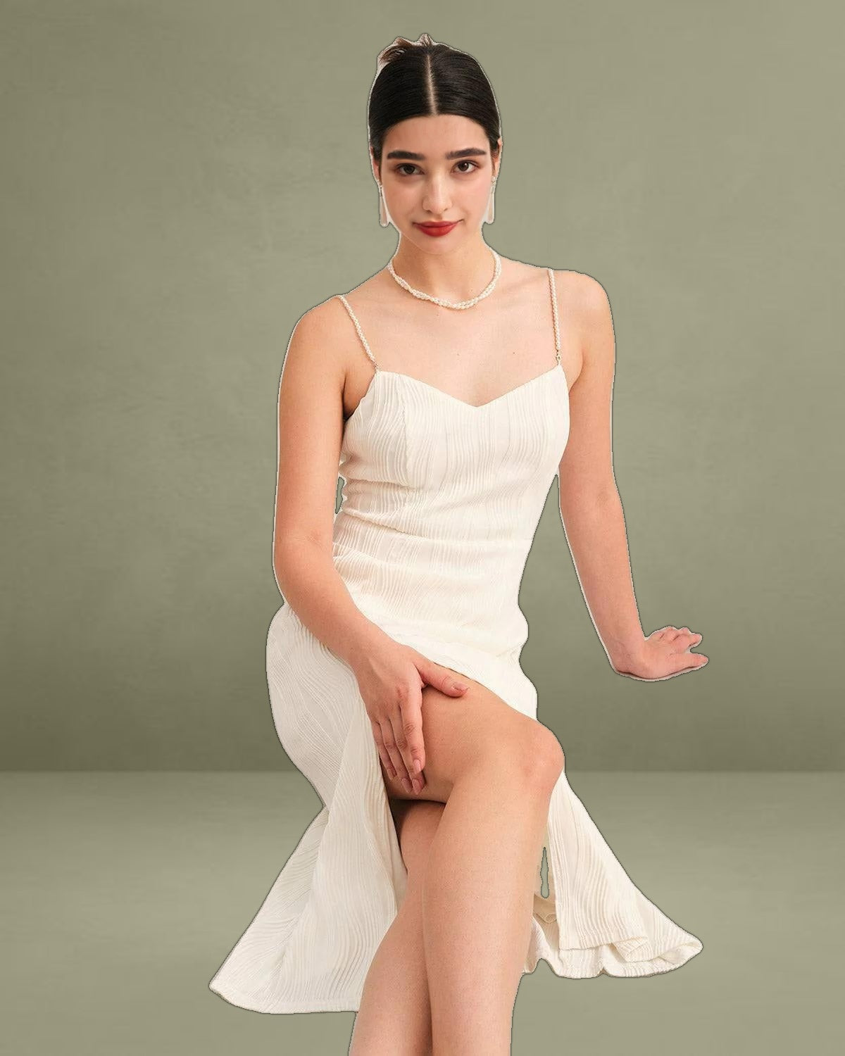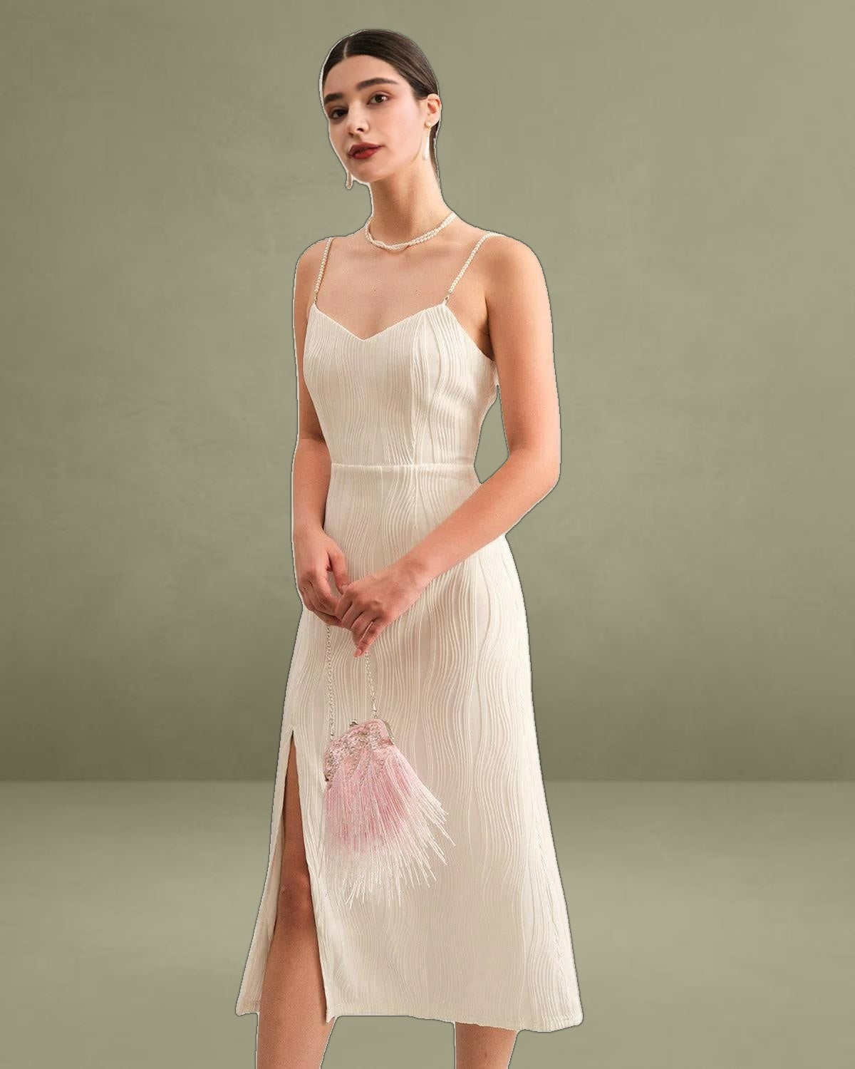 The pearl strap design is for sure the most eye-catching design, novel yet stylish. This midi dress further perfects another two pearl strap dresses by following the pearl strap and wave textured design and adding the side slit design. Compared with other wave textured dresses, its v-neck design better shows females' sexy and grace. Plus, the high-waisted and slim-fit design shape women's body shapes well.