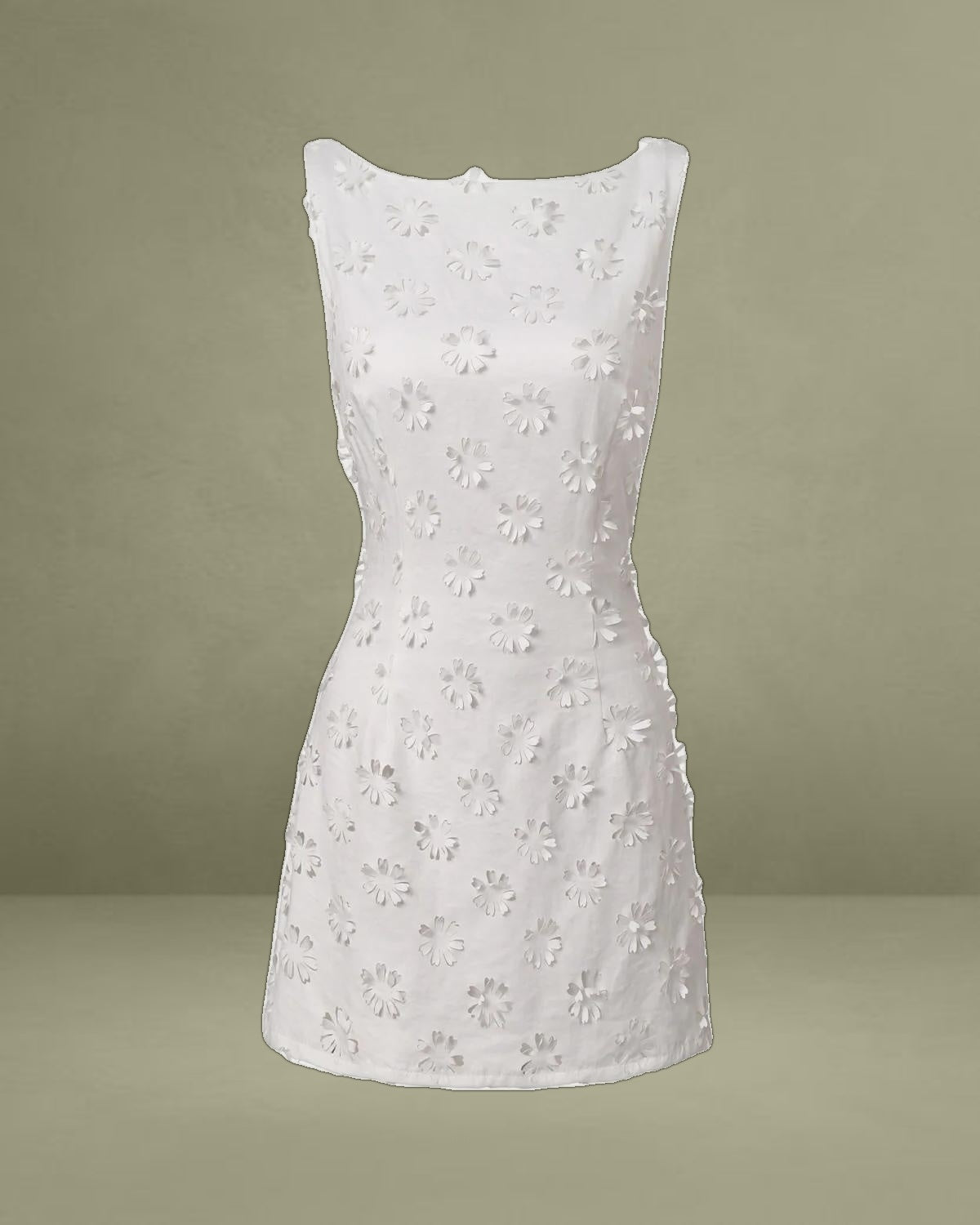 With its sophisticated boat neckline and chic sleeveless design, this mini dress offers a refined yet comfortable fit. The textured fabric adds depth and dimension, while the clean silhouette makes it perfect for casual outings or dressier occasions.