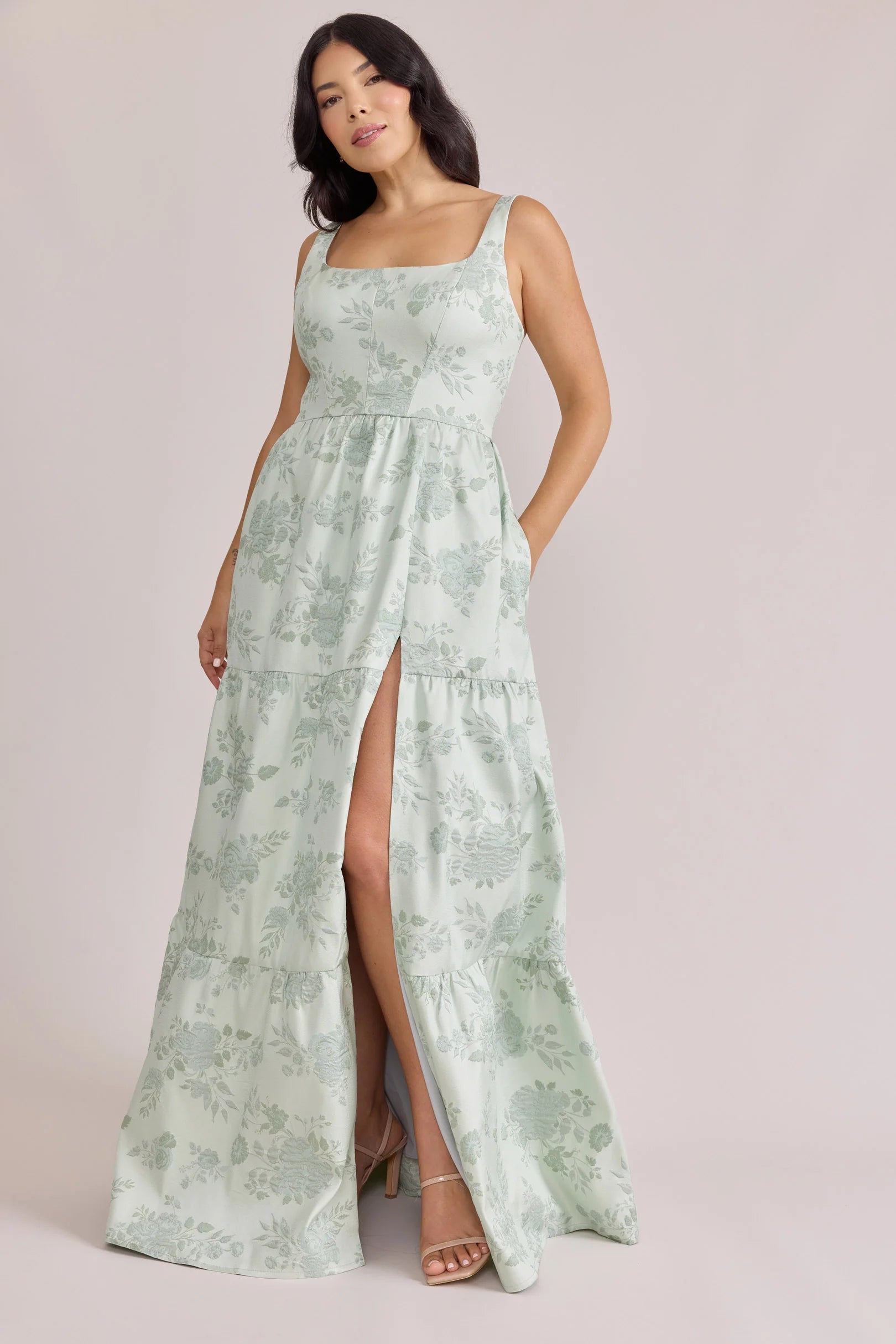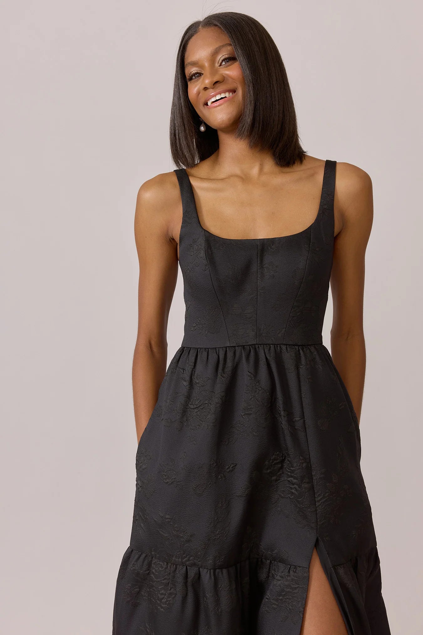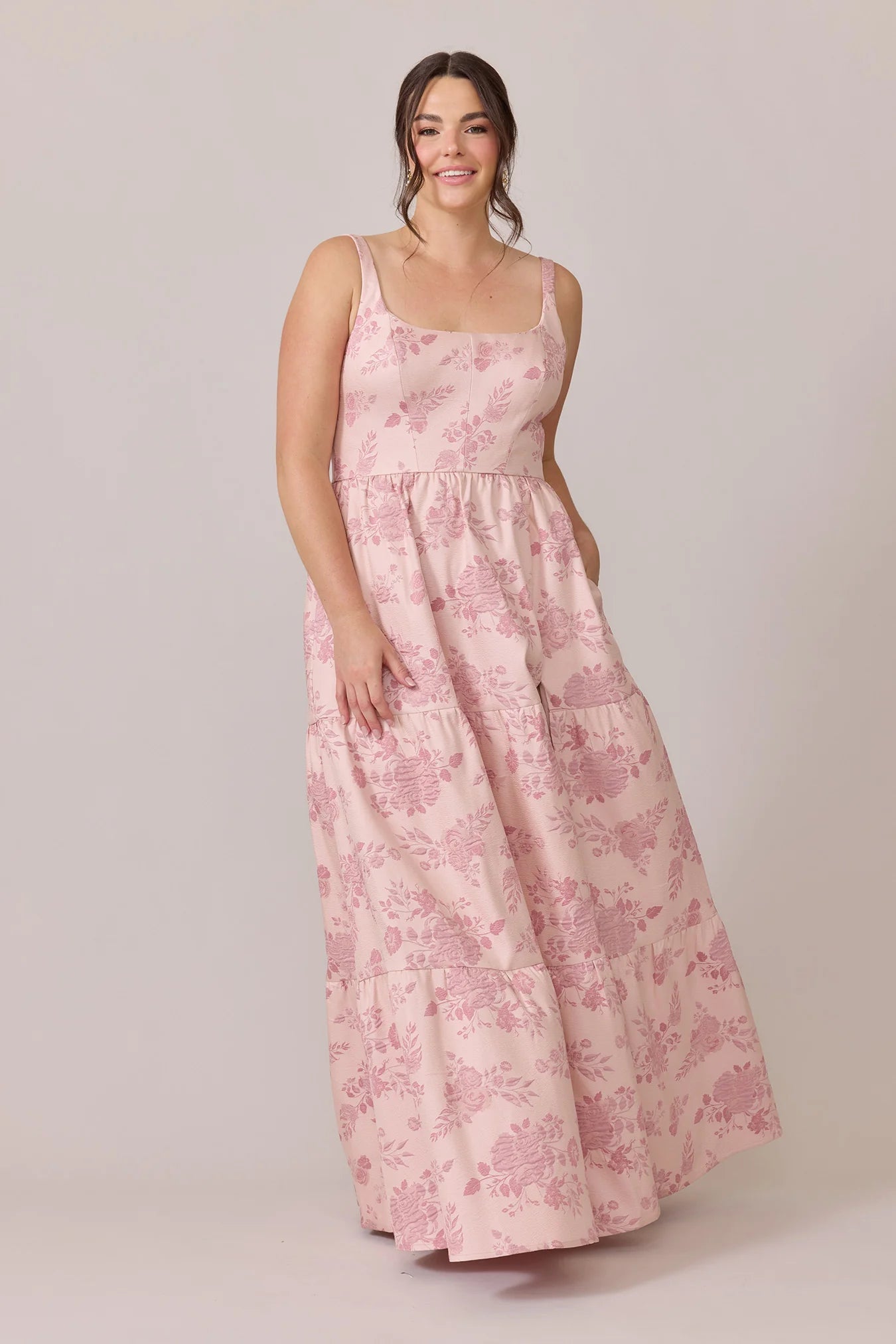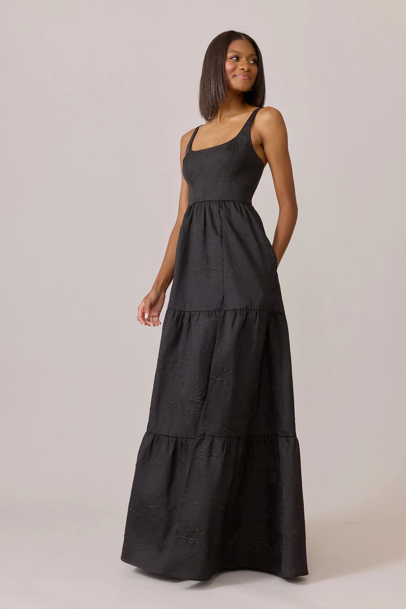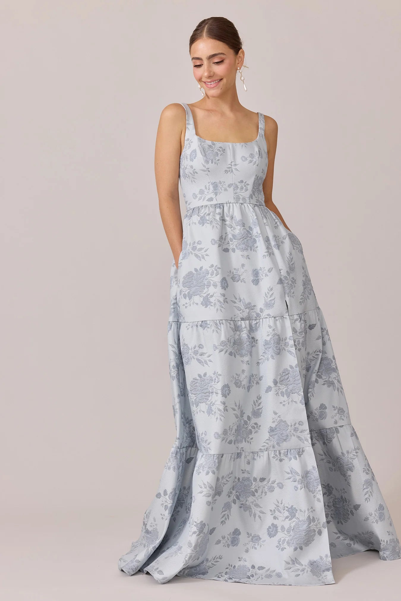 Our Winslet jacquard dress is a timeless style that flatters every body type. With a modern square neckline, Winslet has a fitted, modest bodice that flows into a lightly gathered skirt. The best part? This dress has pockets! Winslet is also available with embellishments.