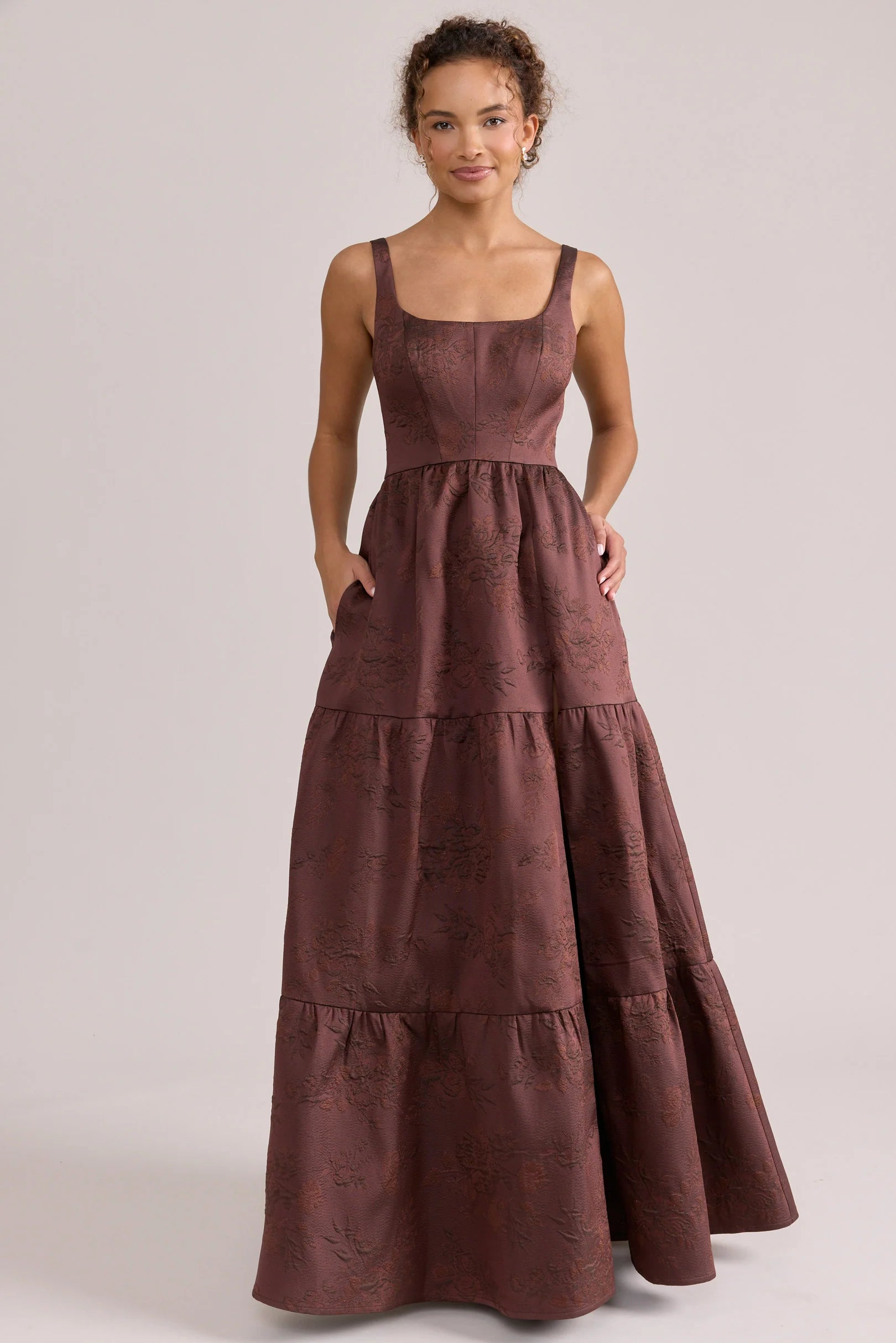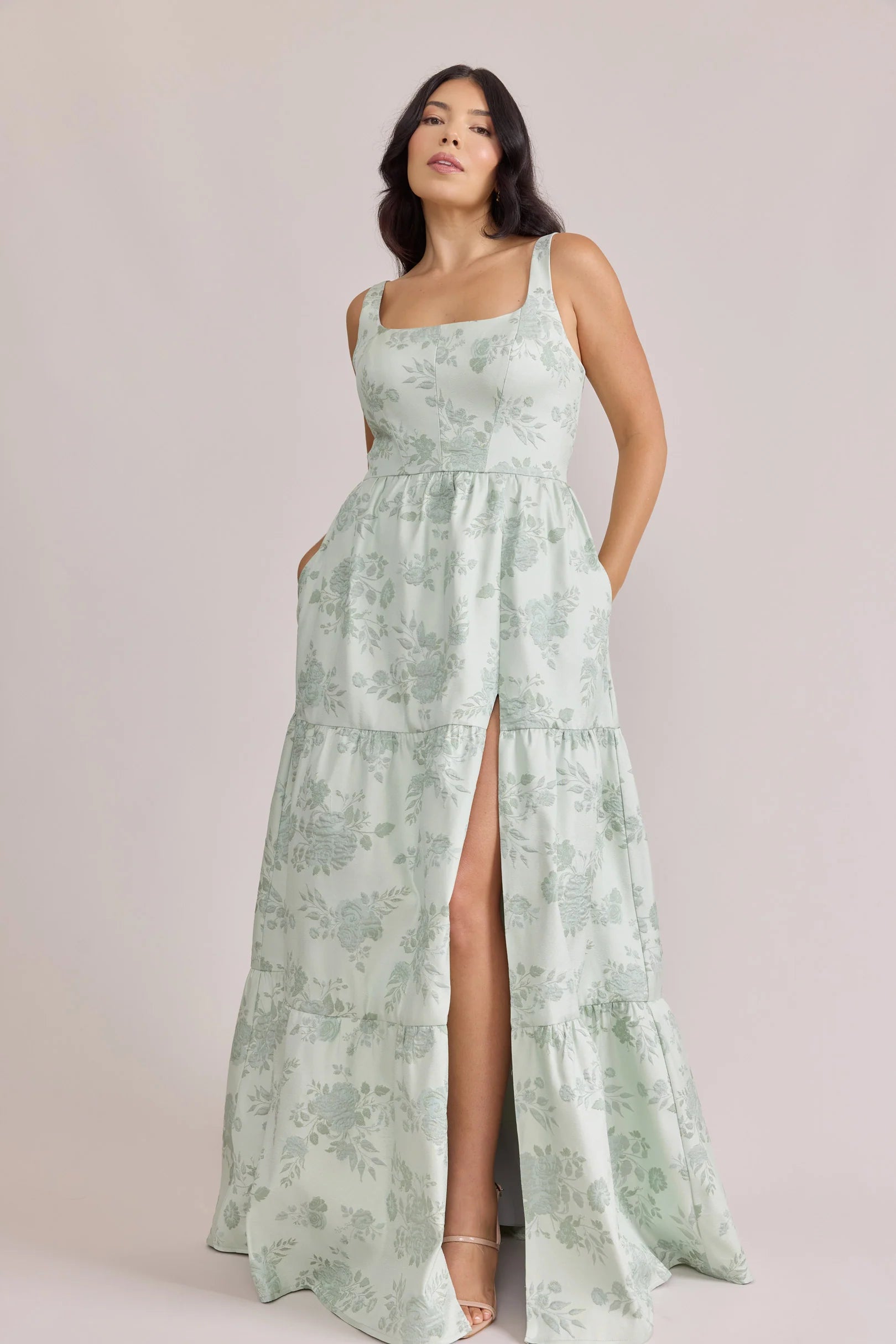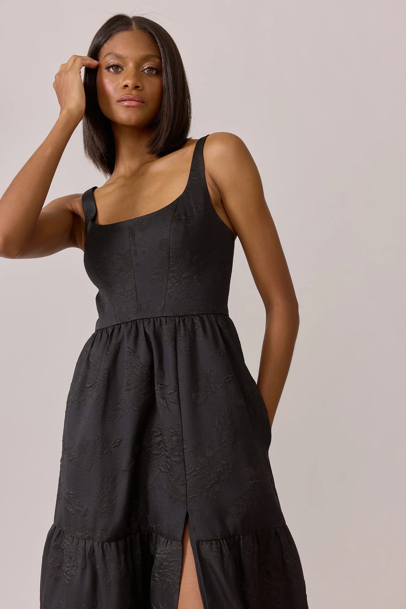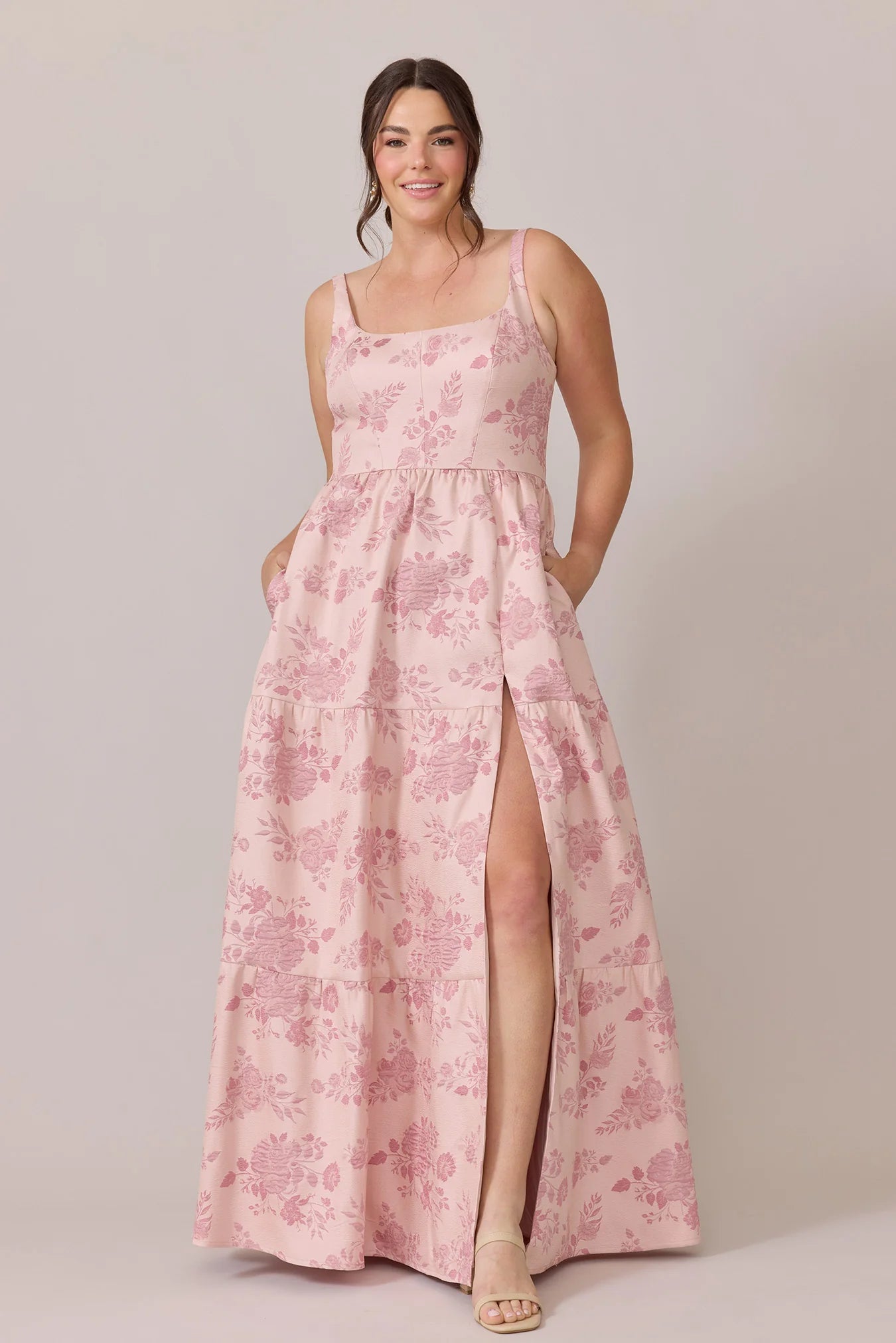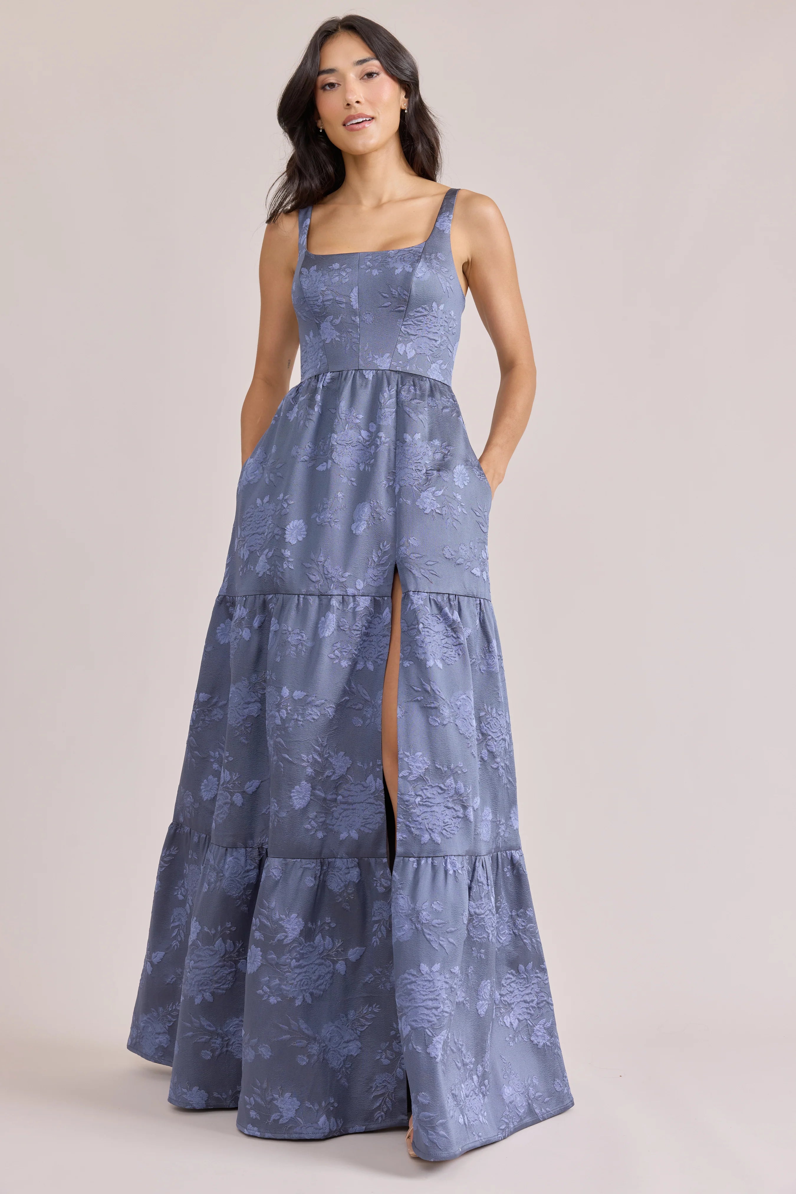Our Winslet jacquard dress is a timeless style that flatters every body type. With a modern square neckline, Winslet has a fitted, modest bodice that flows into a lightly gathered skirt. The best part? This dress has pockets! Winslet is also available with embellishments.