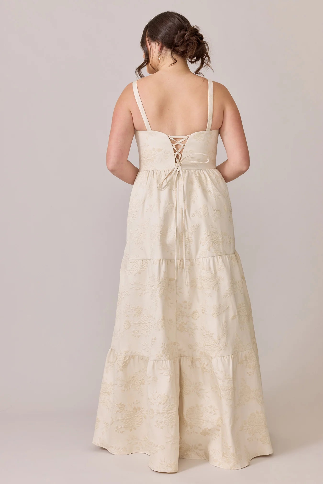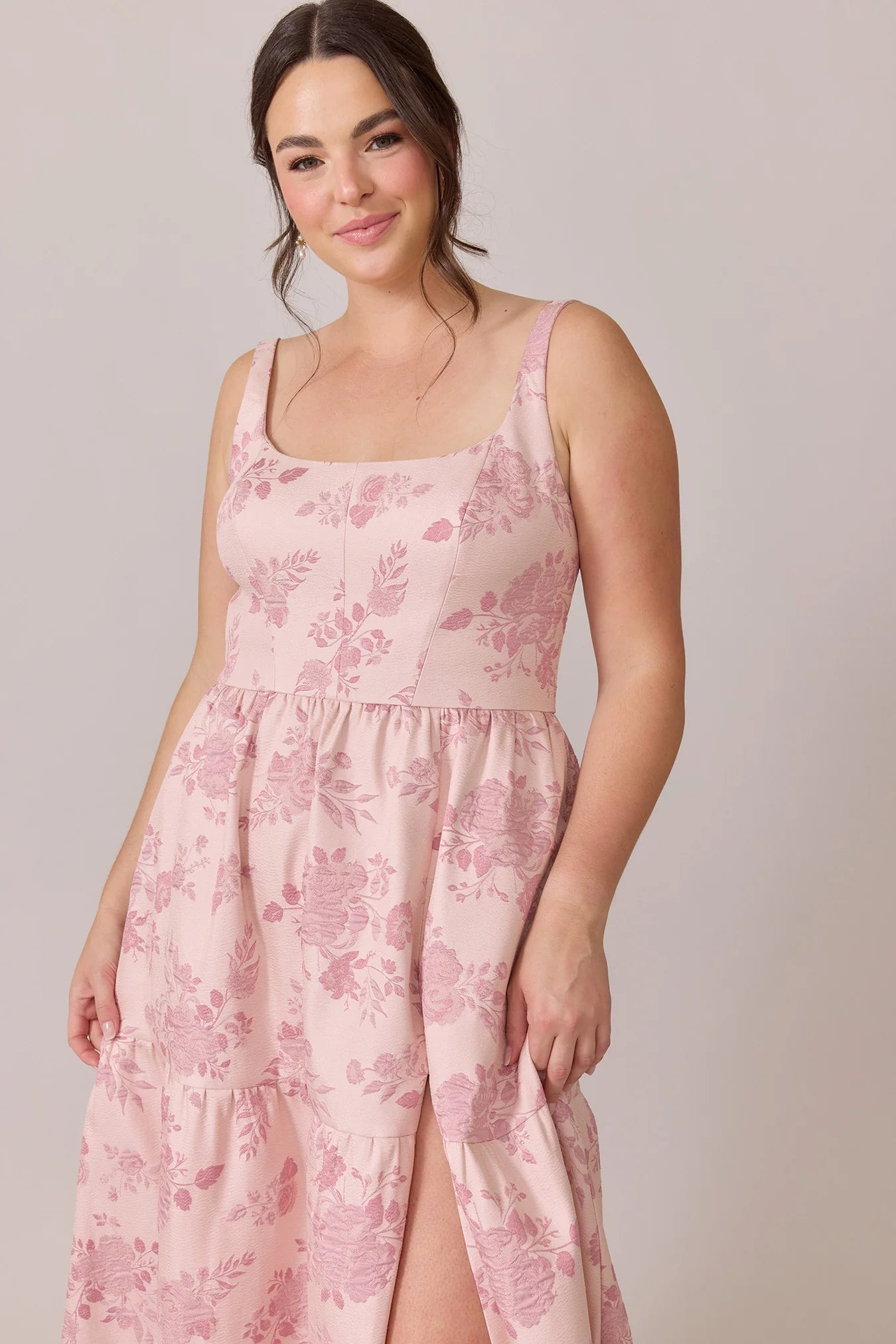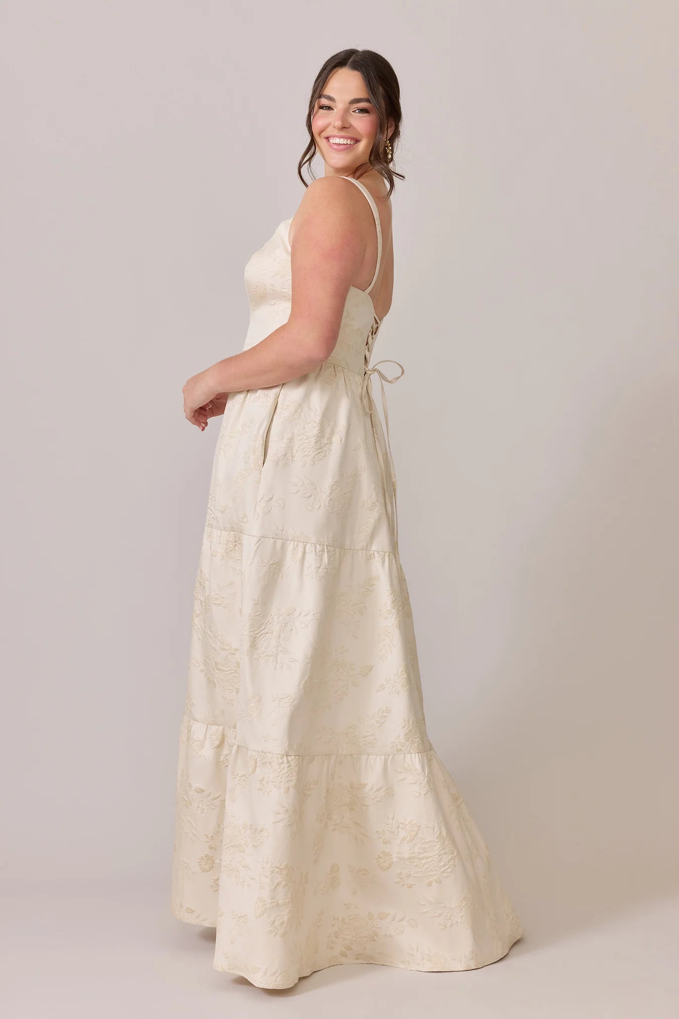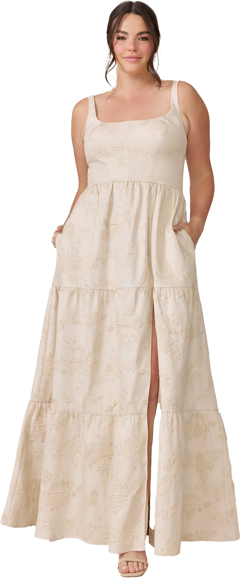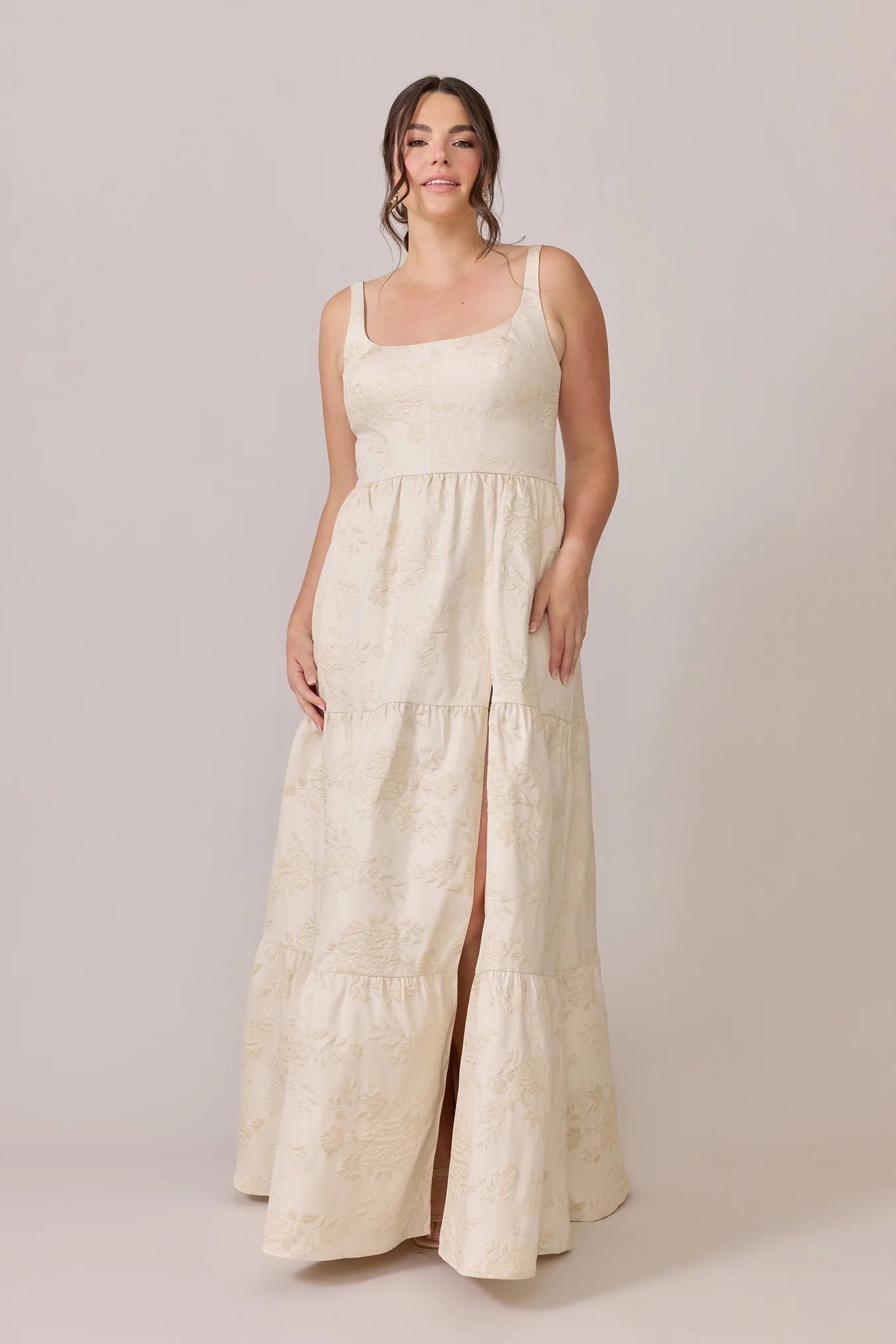 Our Winslet jacquard dress is a timeless style that flatters every body type. With a modern square neckline, Winslet has a fitted, modest bodice that flows into a lightly gathered skirt. The best part? This dress has pockets! Winslet is also available with embellishments.