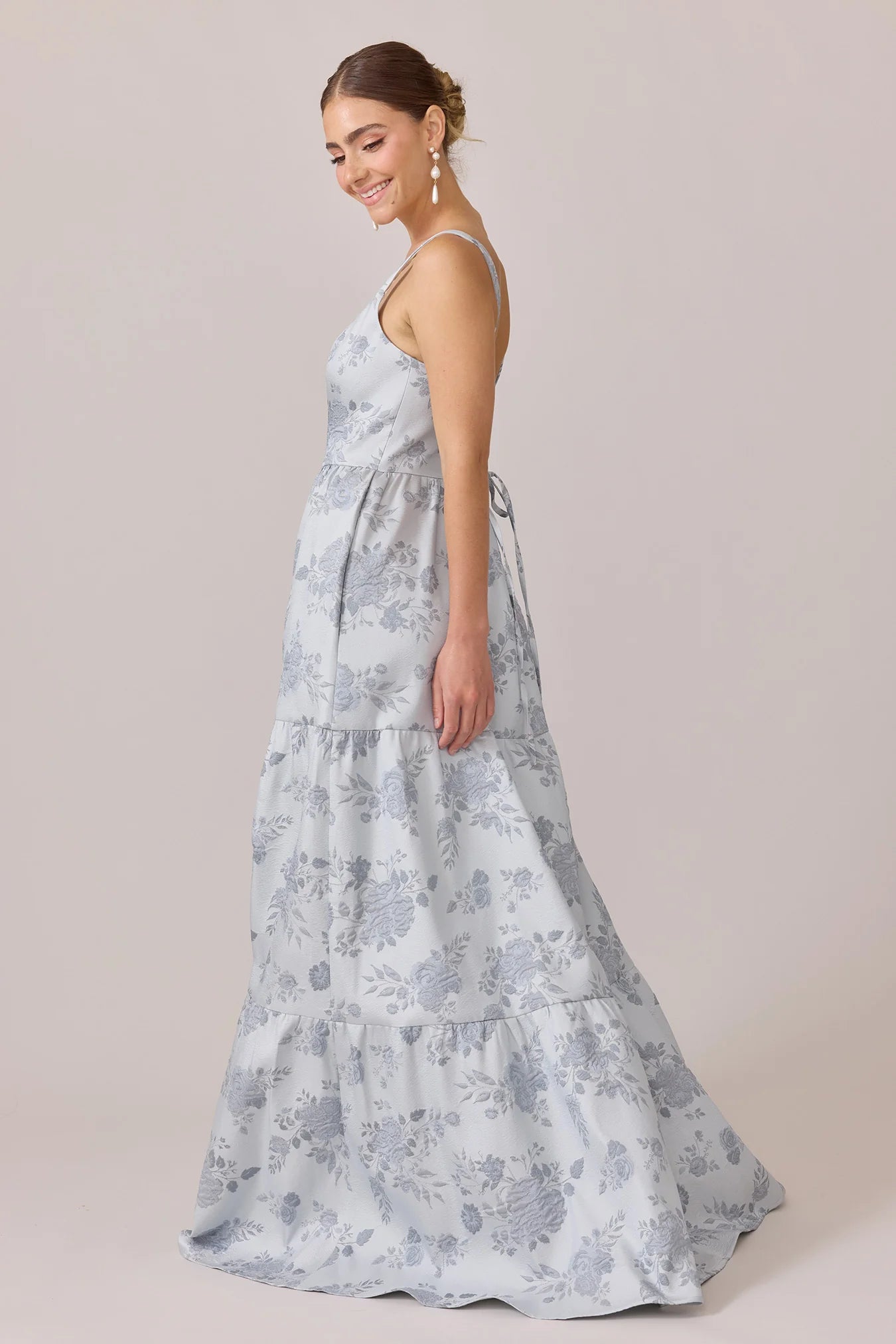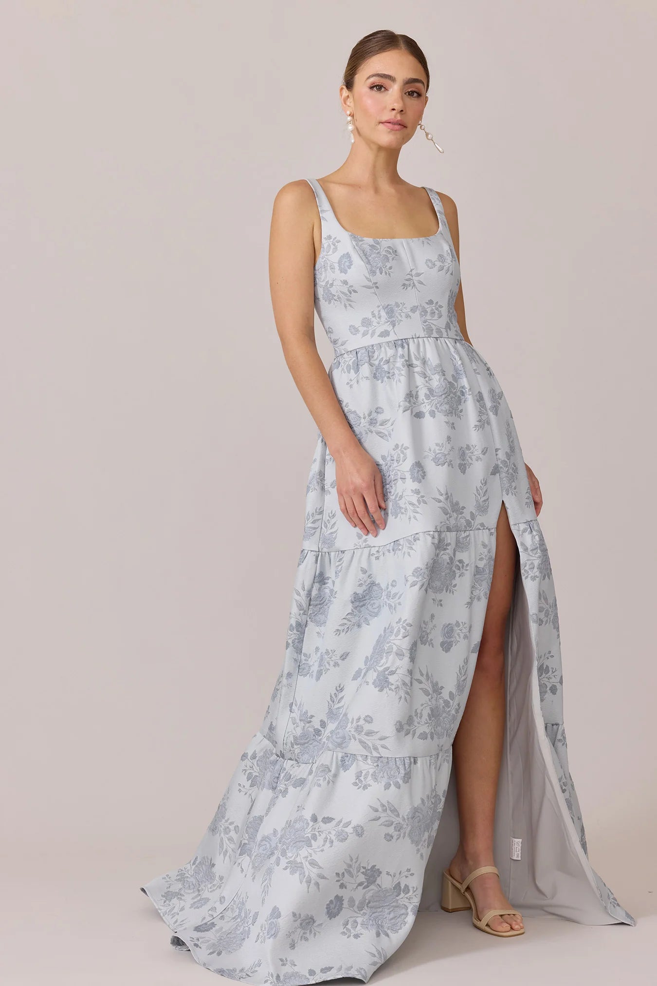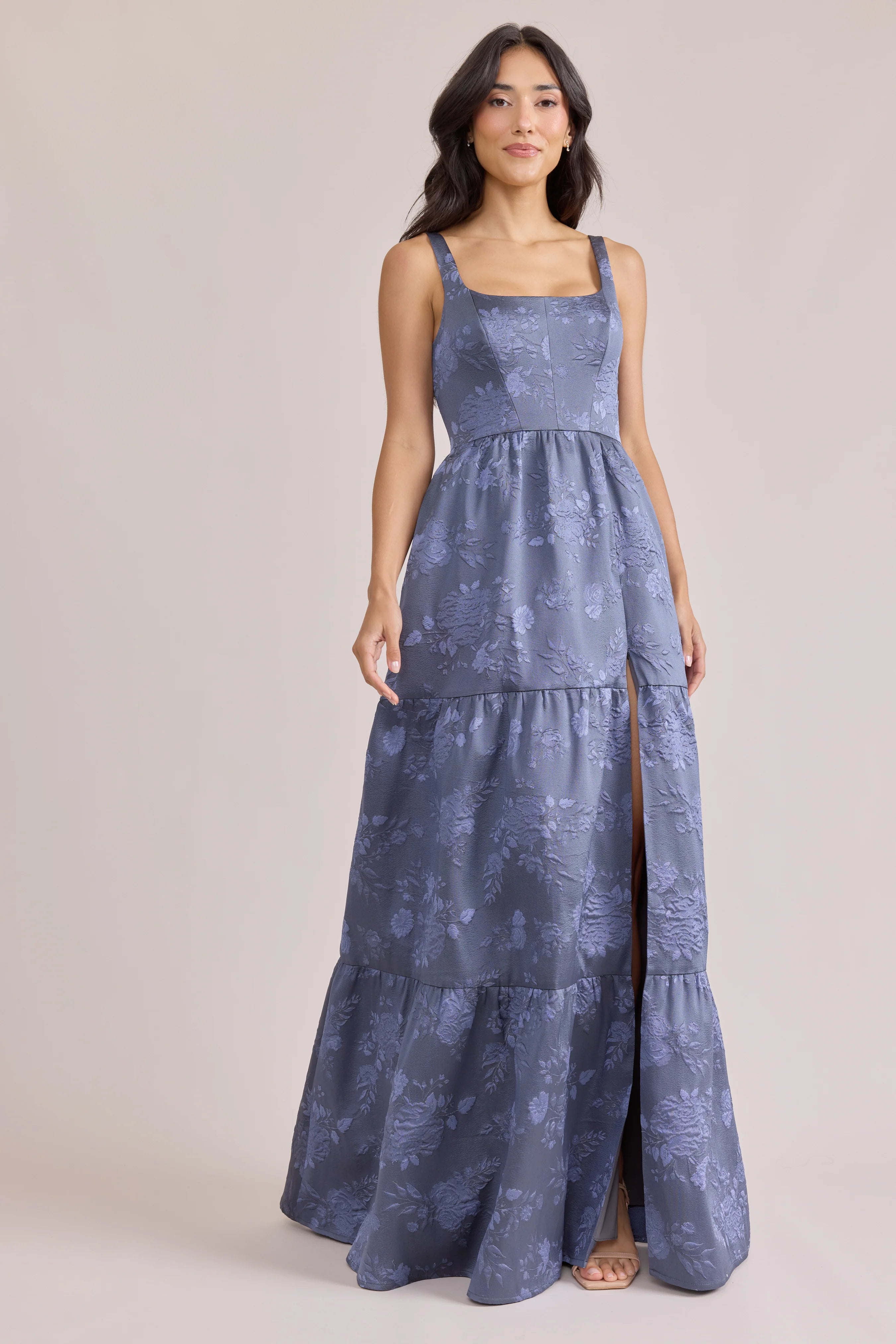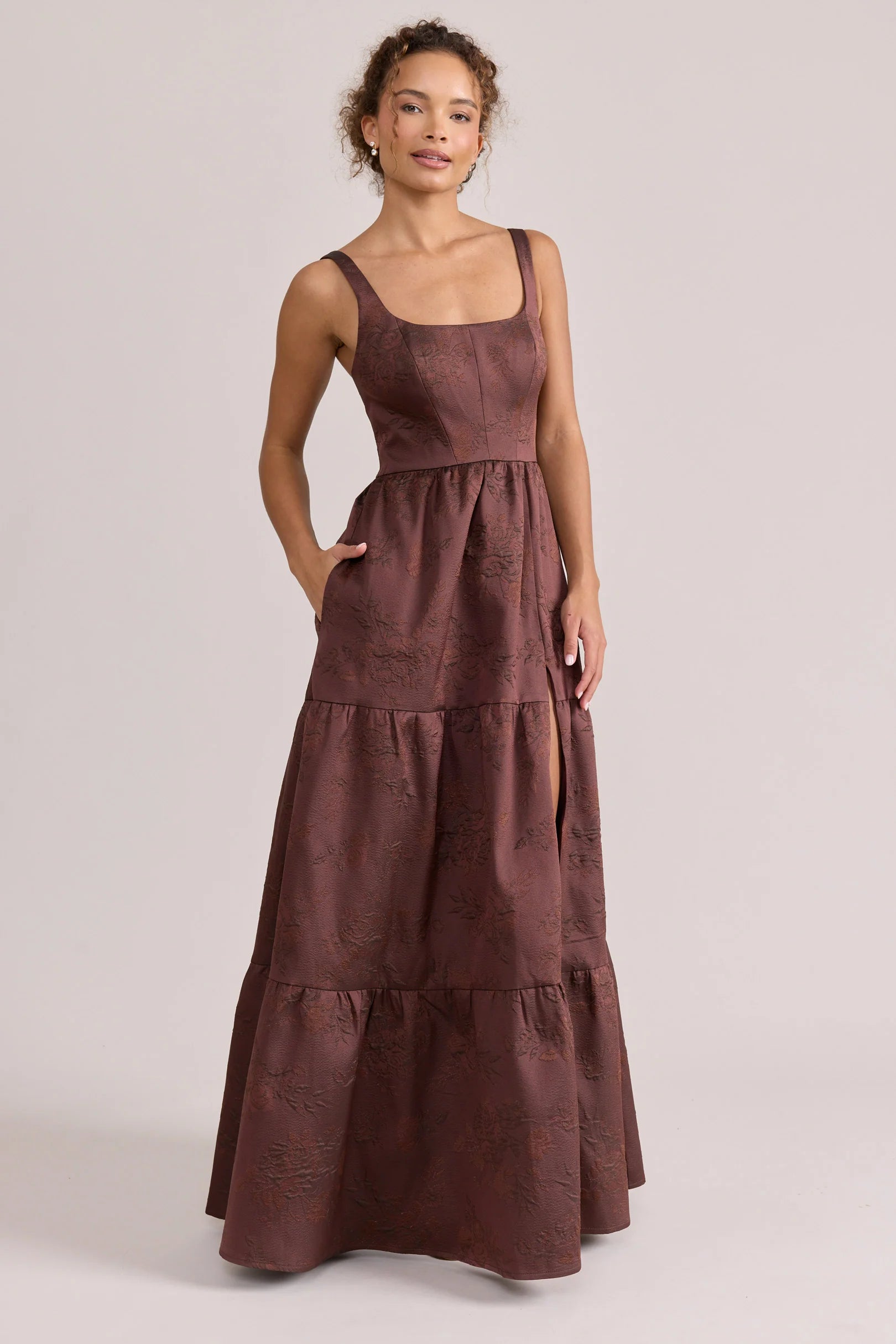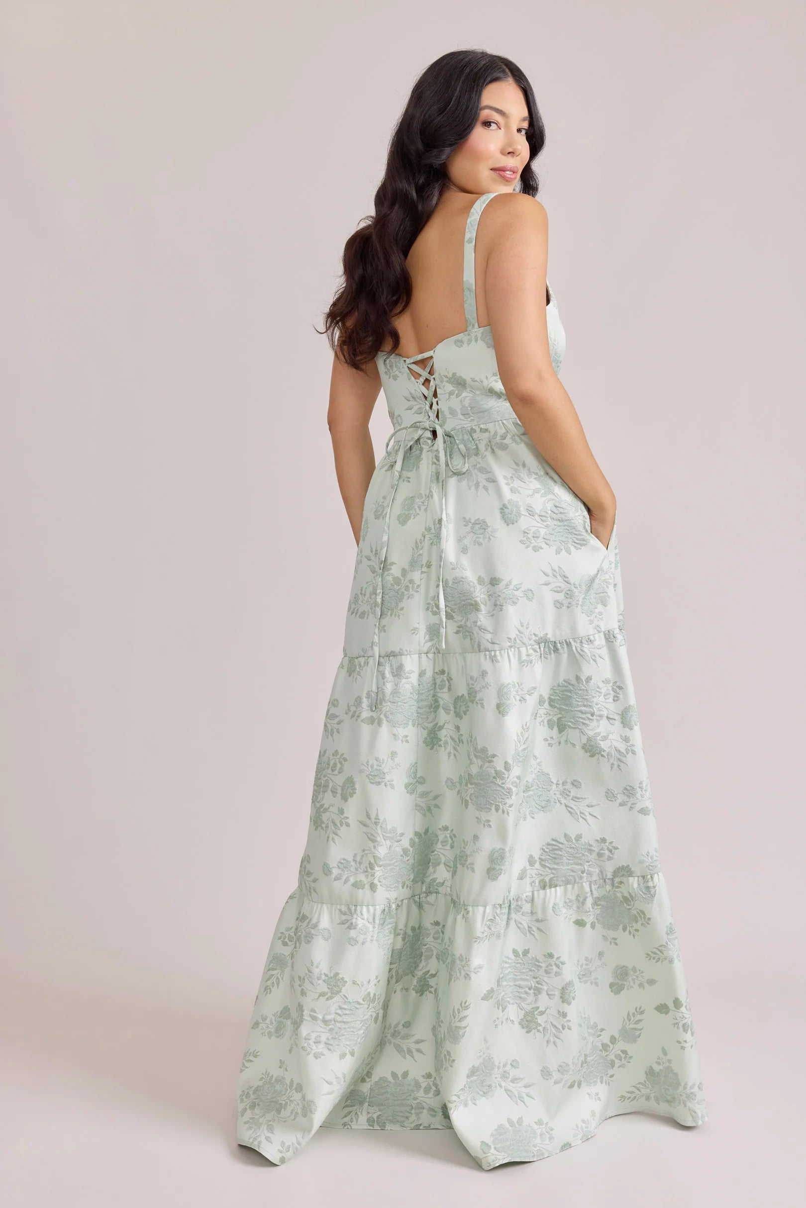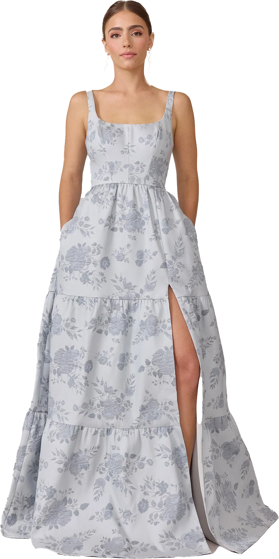 Our Winslet jacquard dress is a timeless style that flatters every body type. With a modern square neckline, Winslet has a fitted, modest bodice that flows into a lightly gathered skirt. The best part? This dress has pockets! Winslet is also available with embellishments.