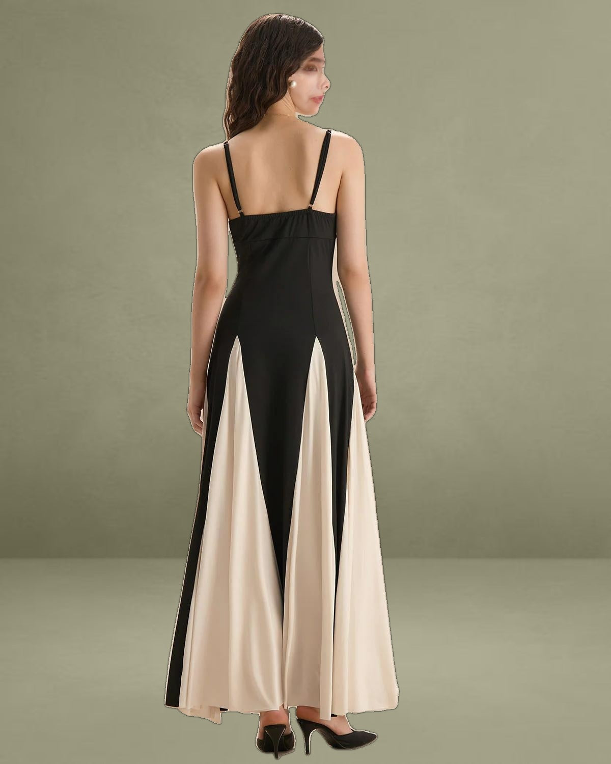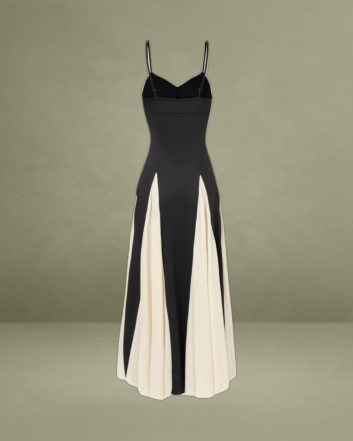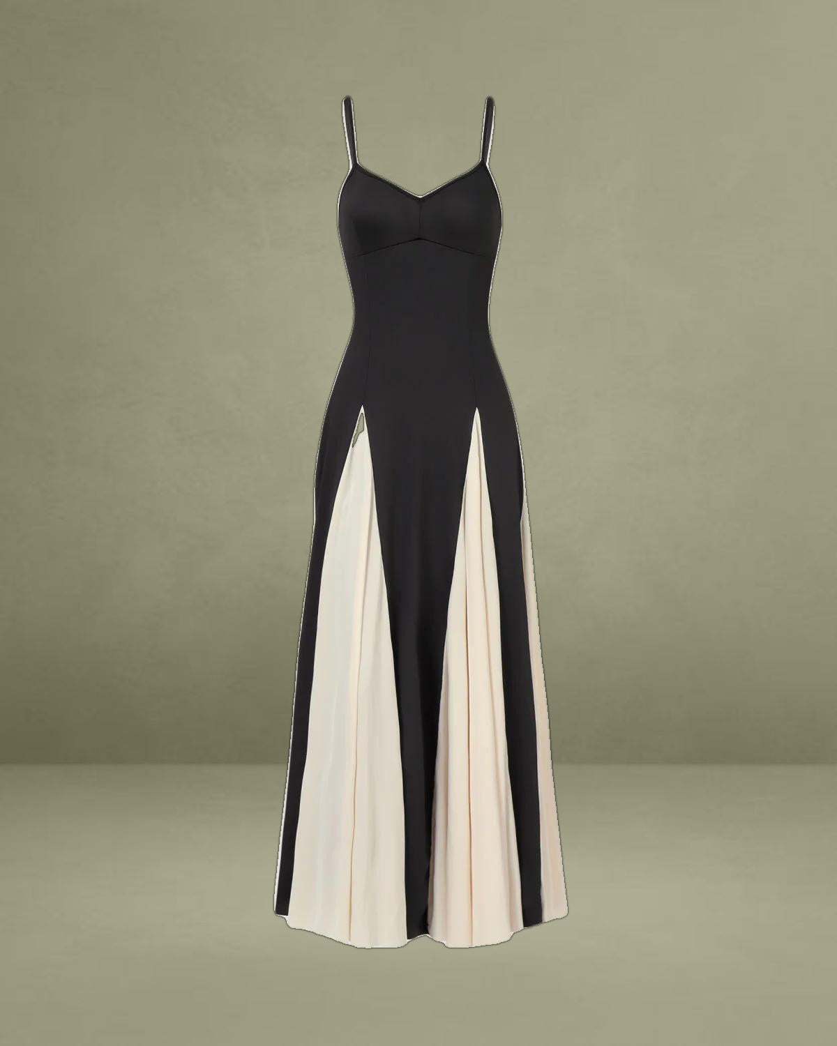 This dress features a sleek slip silhouette complemented by pleated detailing that adds texture and movement. The contrasting elements enhance its sophisticated black base, making it a standout choice for any occasion. Ideal for evening events or formal gatherings, this maxi dress offers a graceful and refined look.