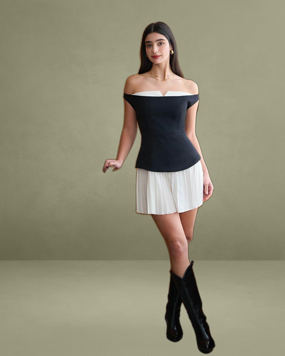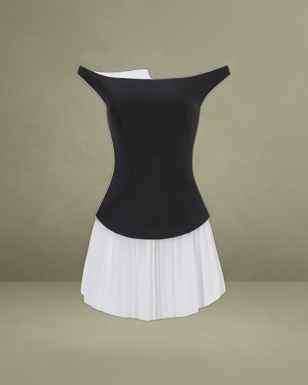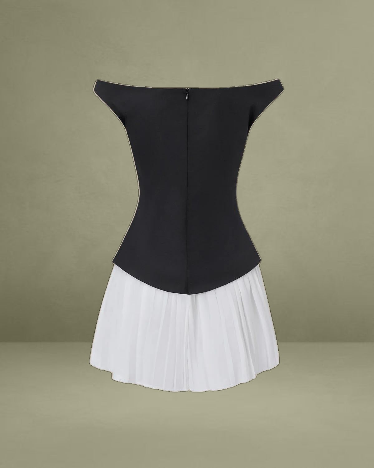 Featuring an elegant off-shoulder neckline, this dress showcases a striking contrast detail that adds a modern twist to a classic silhouette. The form-fitting cut highlights your figure, while the mini length offers a playful edge.