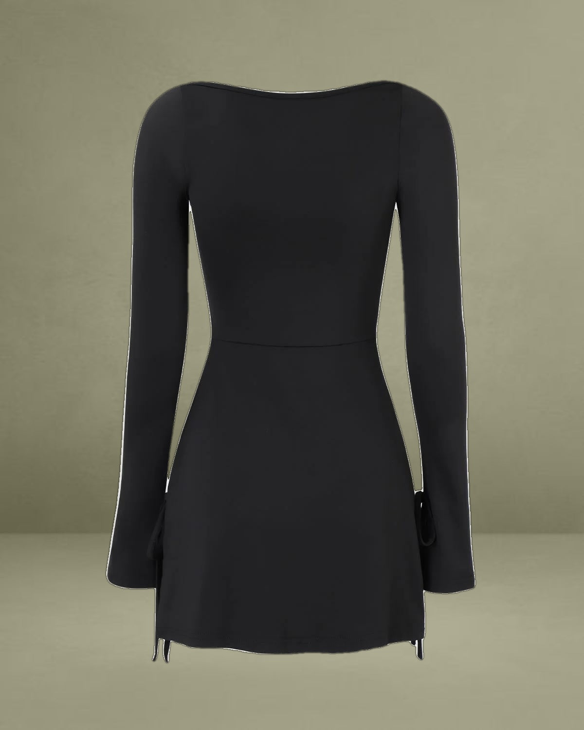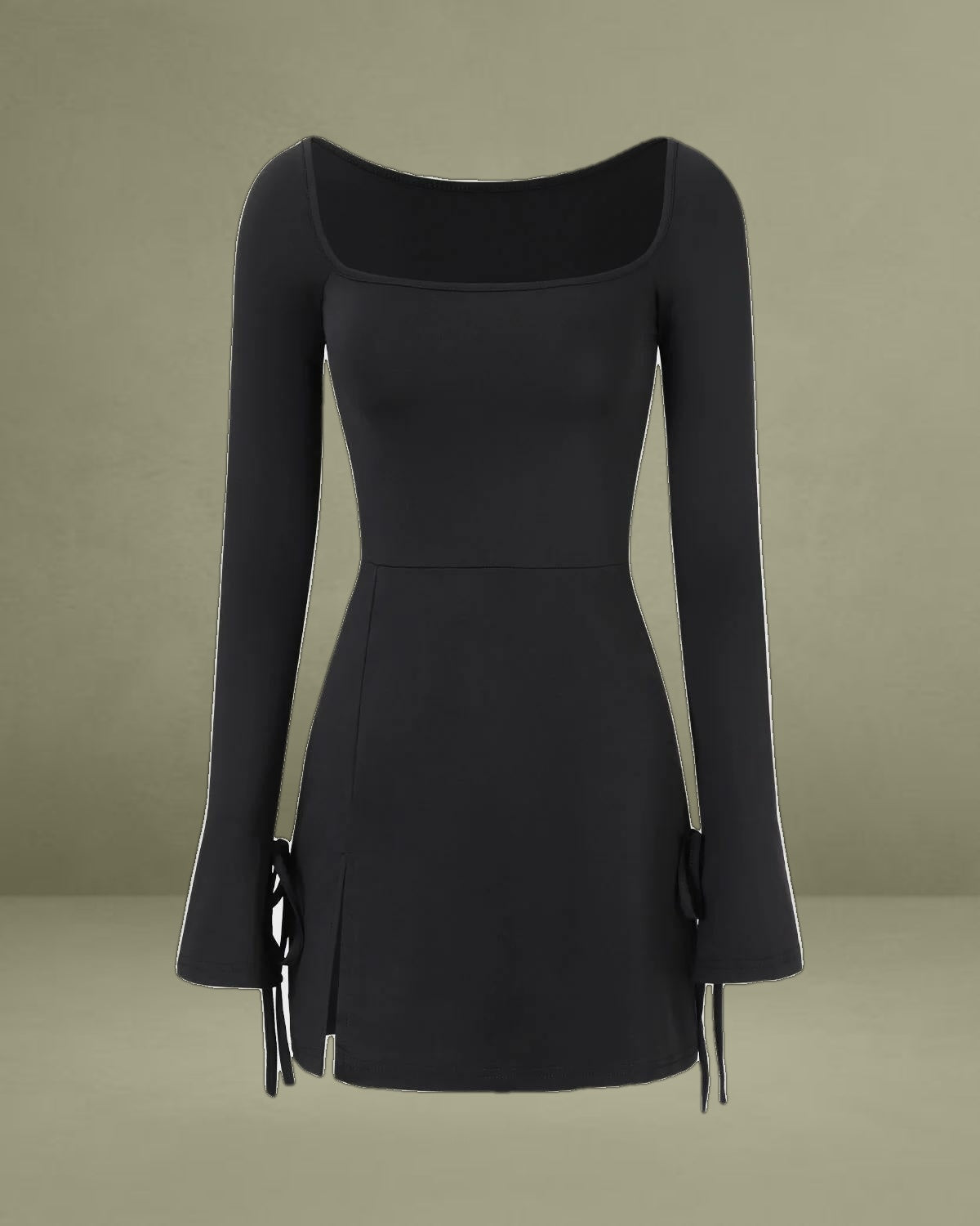 This chic mini dress showcases a sleek square neckline and fitted long sleeves, providing a flattering and modern silhouette. Made from a soft, stretchy knit fabric, it offers both comfort and style, making it perfect for any occasion.