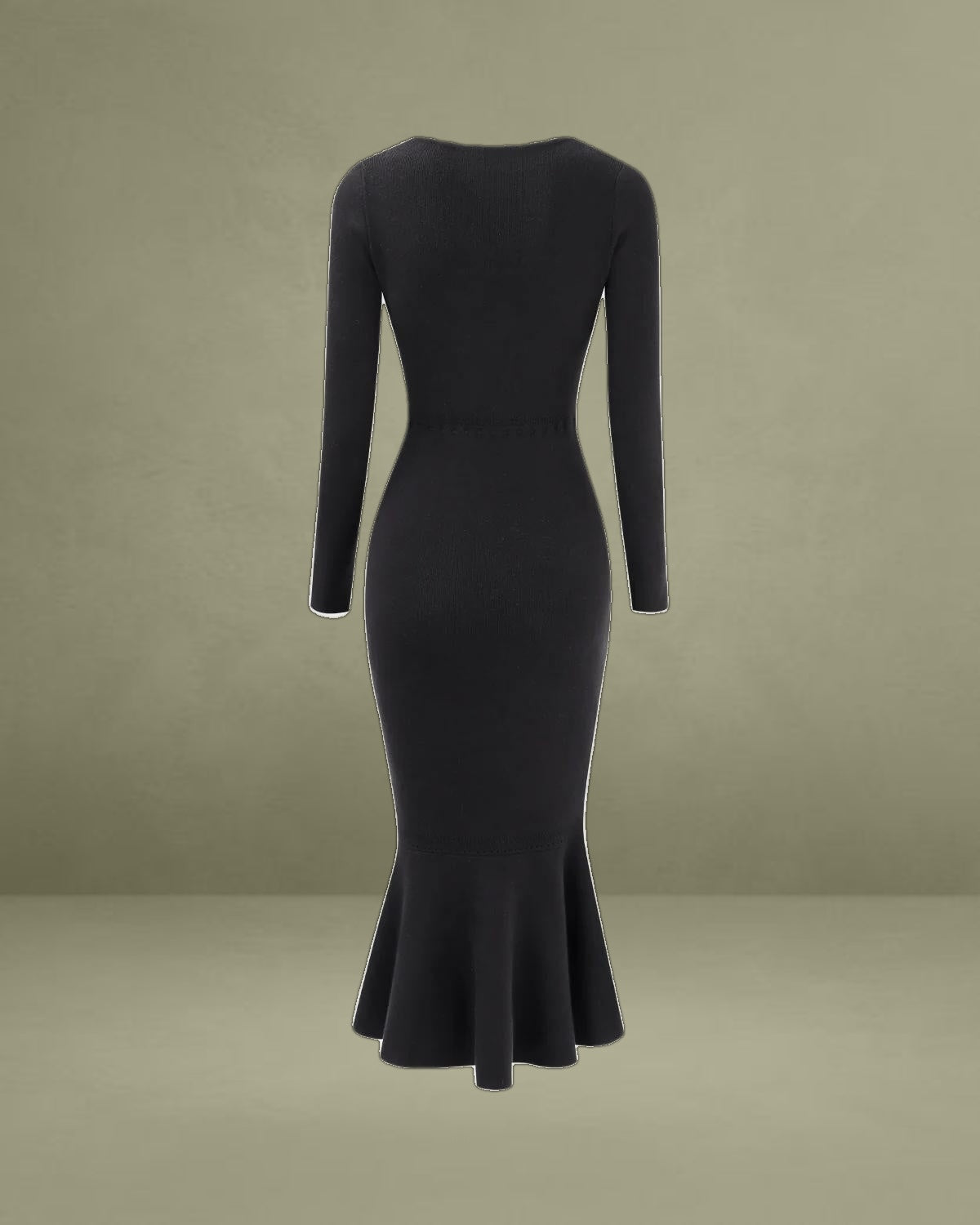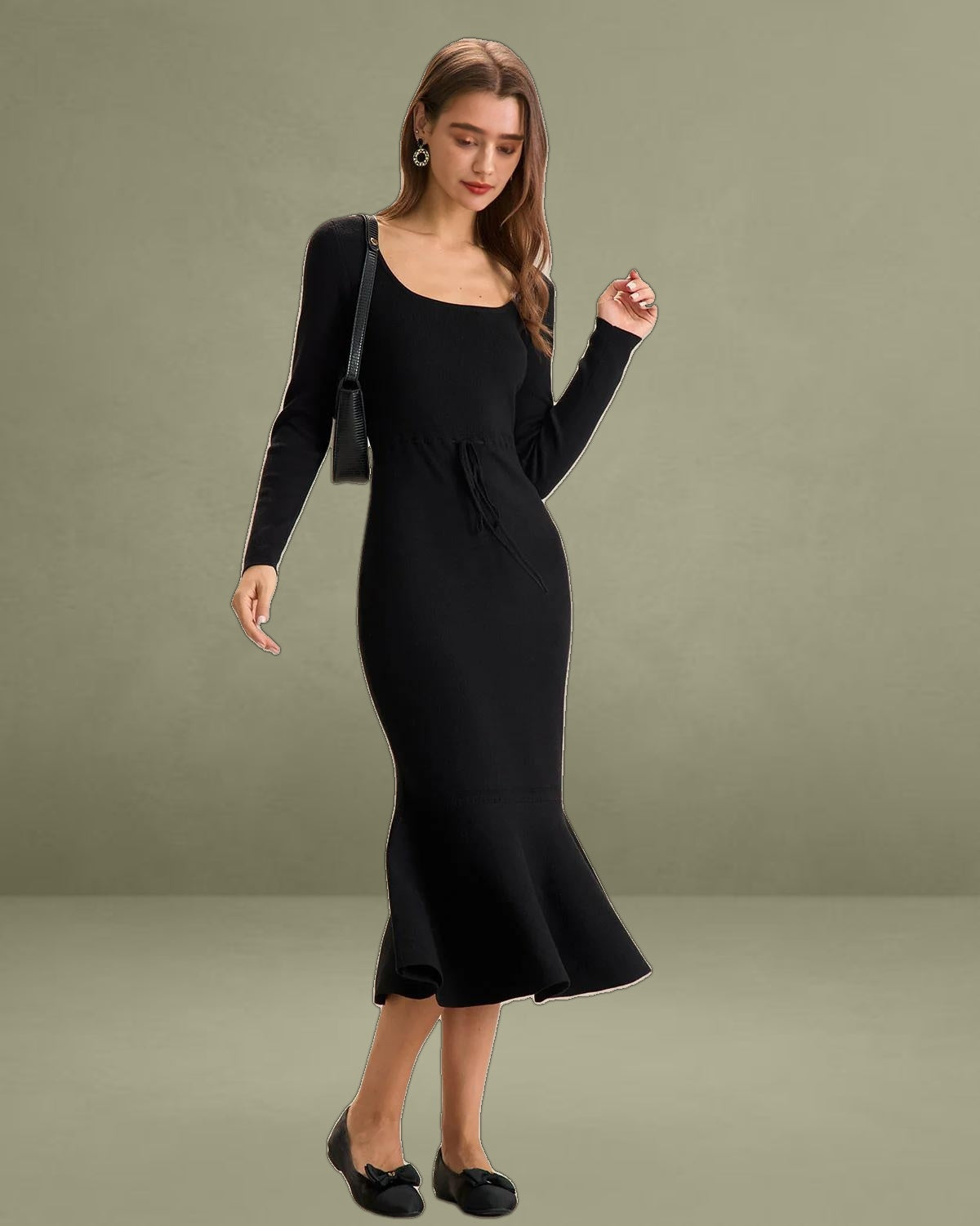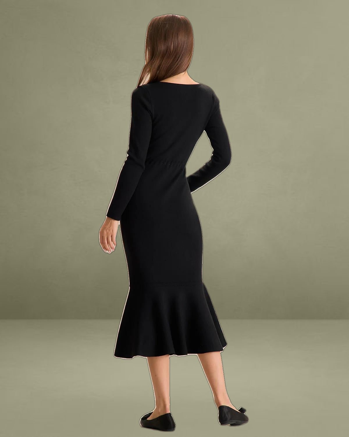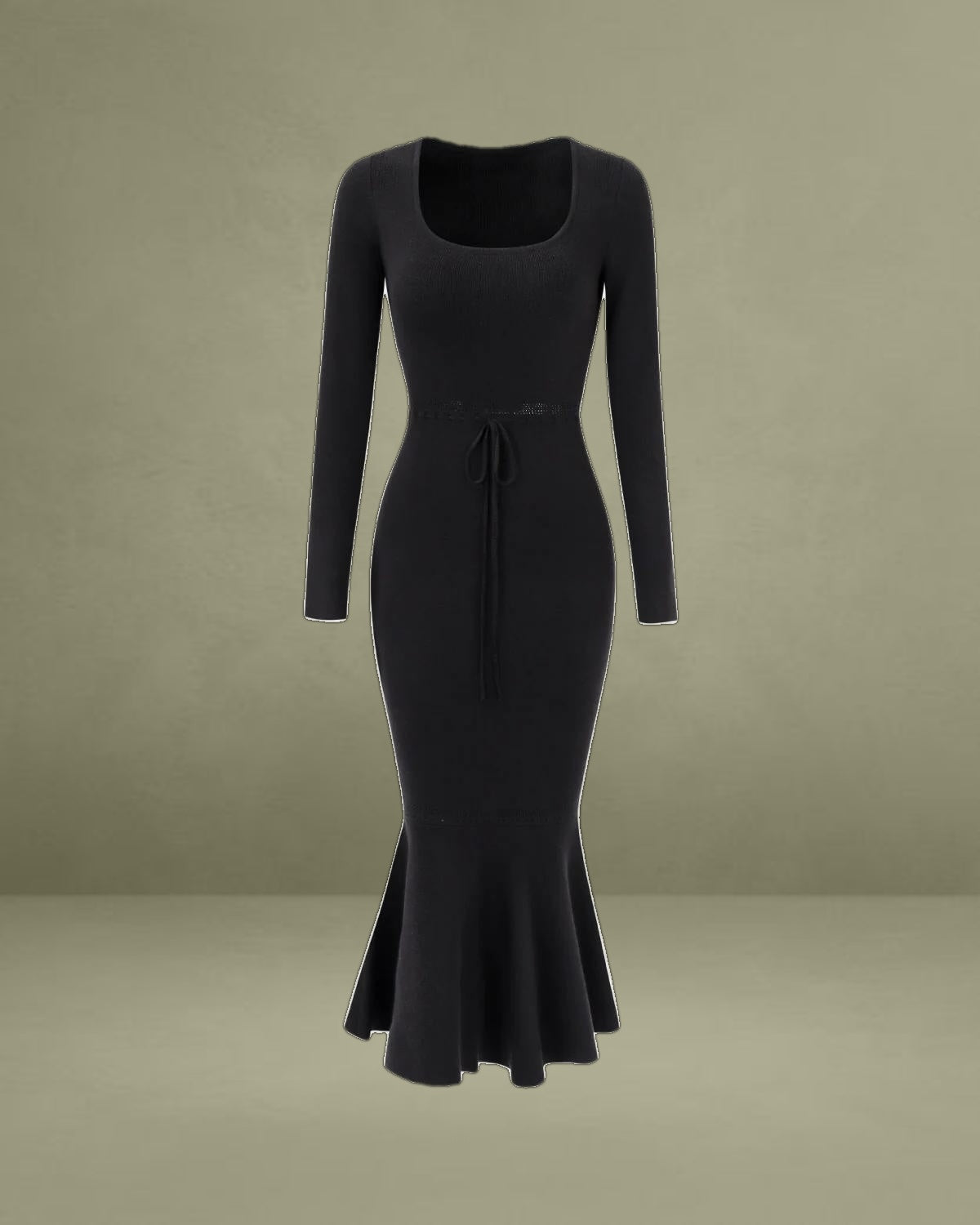 Featuring a square neckline and a flattering mermaid silhouette, this dress hugs the body in soft knit fabric. Perfect for both formal and casual settings, it offers an elegant look with effortless style.