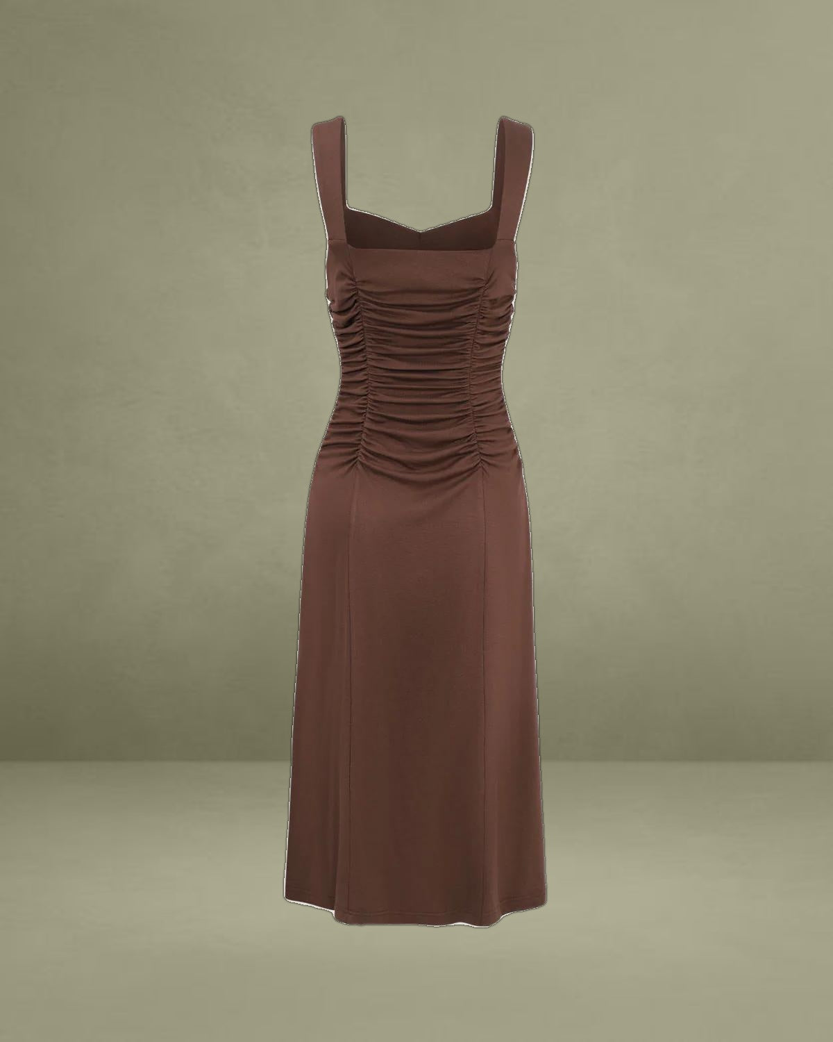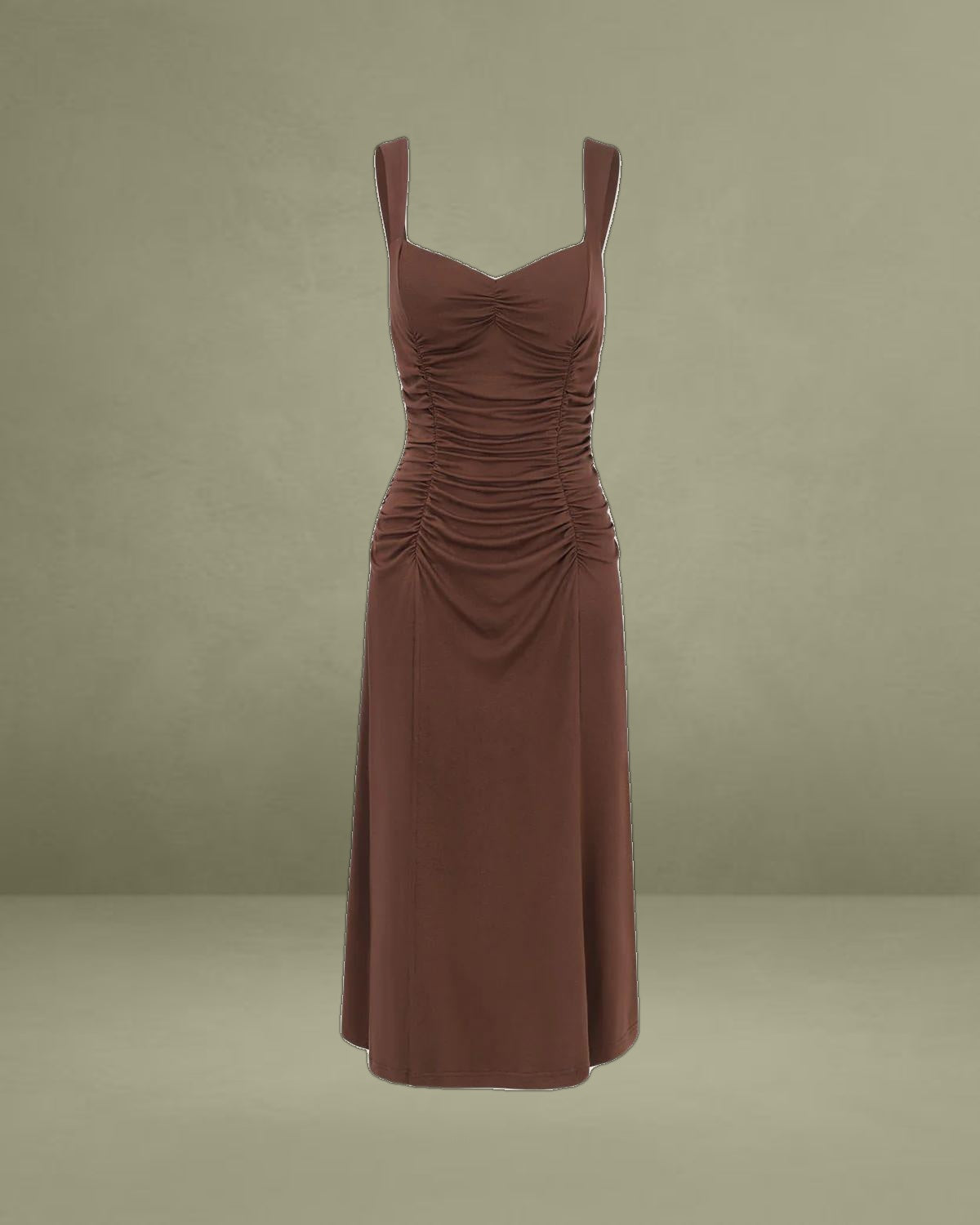 The dress has a stylish ruched design that enhances your figure. The soft knitted material provides a comfortable wearing experience. The deep brown color gives a warm touch to your appearance, making it suitable for both casual outings and evening functions.