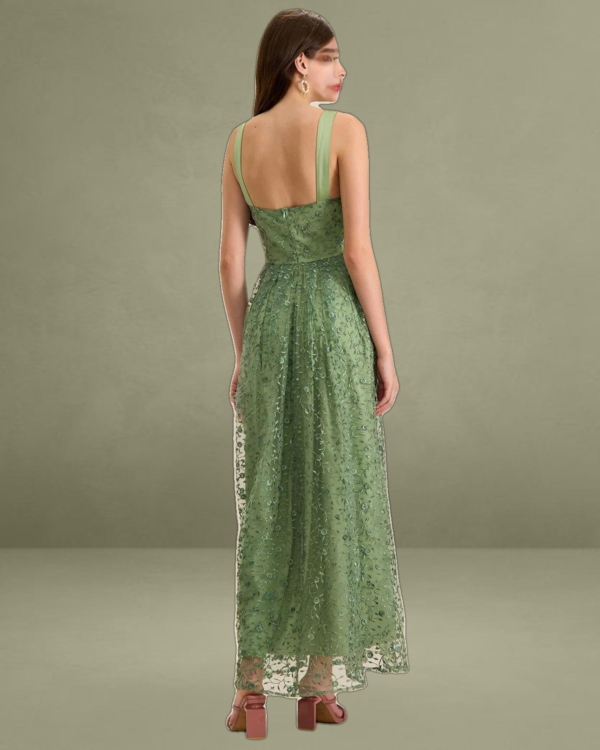 The slip maxi design offers a graceful silhouette that flows elegantly, perfect for garden parties, weddings, or any special event. The lush green hue enhances the dress's romantic charm, while the embroidered details add a touch of sophistication.